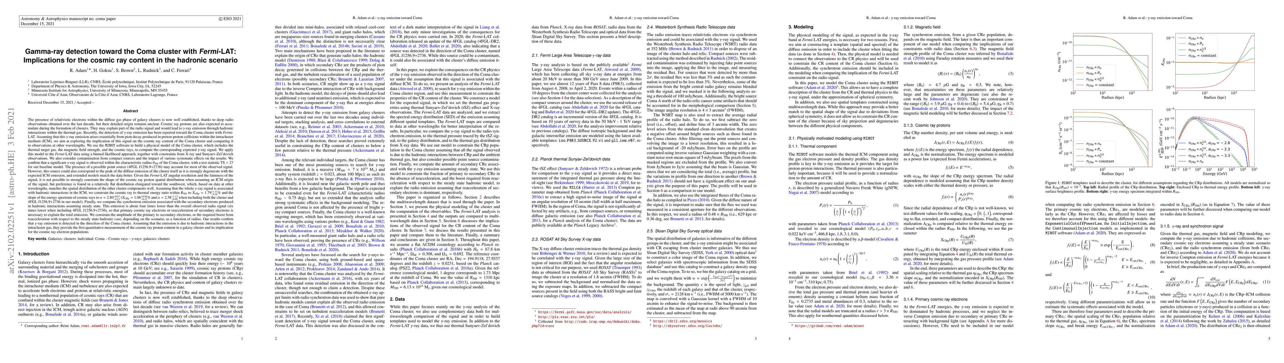 This paper reports the detection of gamma-ray emission from the Coma cluster using Fermi-LAT, suggesting it arises from hadronic interactions of cosmic ray protons in the intracluster medium. The study constrains the cosmic ray to thermal energy ratio and finds the emission is insufficient to explain the observed radio signal without additional electron mechanisms.