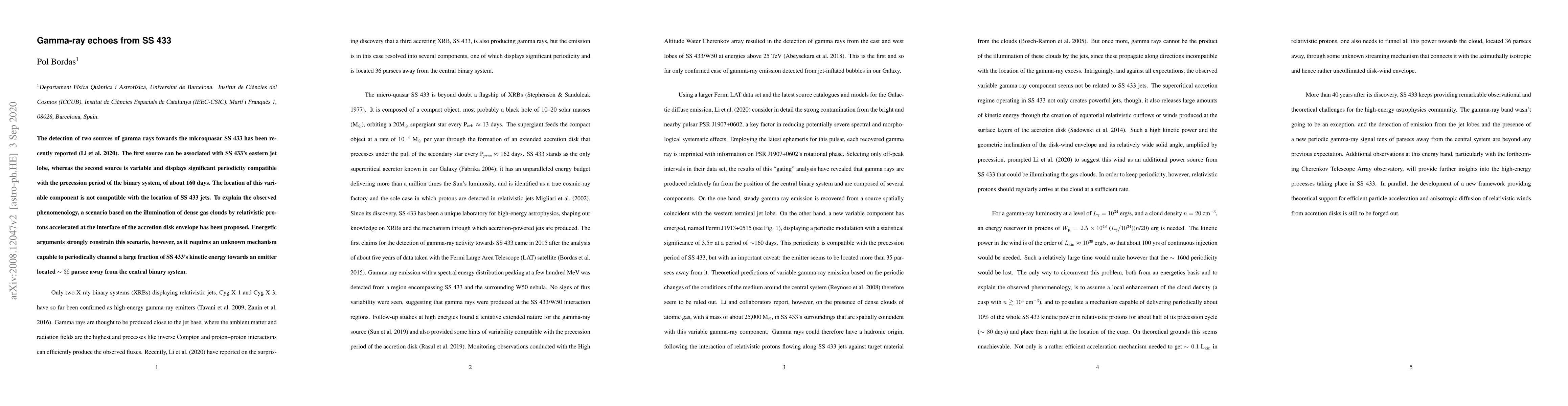 The paper reports the detection of two gamma-ray sources linked to the microquasar SS 433, with one tied to the eastern jet and the other variable, matching the binary system's precession period. A proposed scenario involving relativistic protons illuminating distant gas clouds faces energetic constraints.