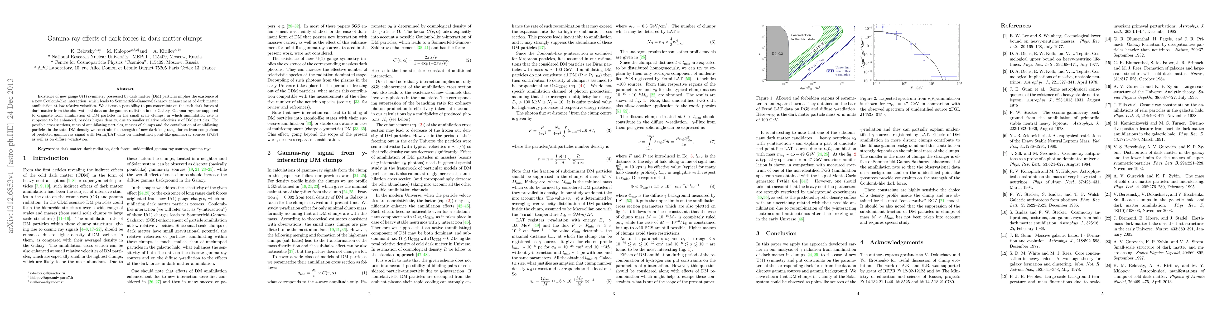 This paper explores the potential gamma-ray signals from dark matter annihilation in clumps, driven by a new gauge U(1) symmetry and its associated long-range force. It aims to constrain the strength of these dark forces by comparing predicted gamma-ray emissions with observational data from the Fermi/LAT, particularly unidentified point-like sources and diffuse gamma radiation.