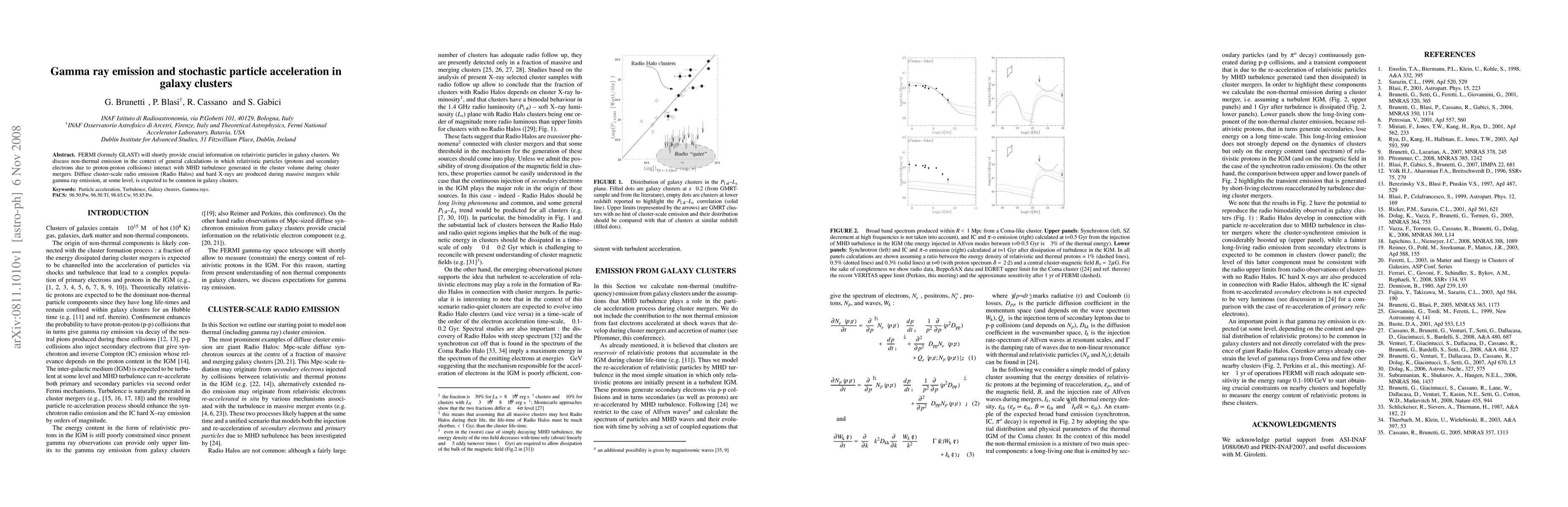 FERMI (formely GLAST) will shortly provide crucial information on relativistic particles in galaxy clusters. We discuss non-thermal emission in the context of general calculations in which relativistic particles (protons and secondary electrons due to proton-proton collisions) interact with MHD turbulence generated in the cluster volume during cluster mergers. Diffuse cluster-scale radio emission (Radio Halos) and hard X-rays are produced during massive mergers while gamma ray emission, at some level, is expected to be common in galaxy clusters.