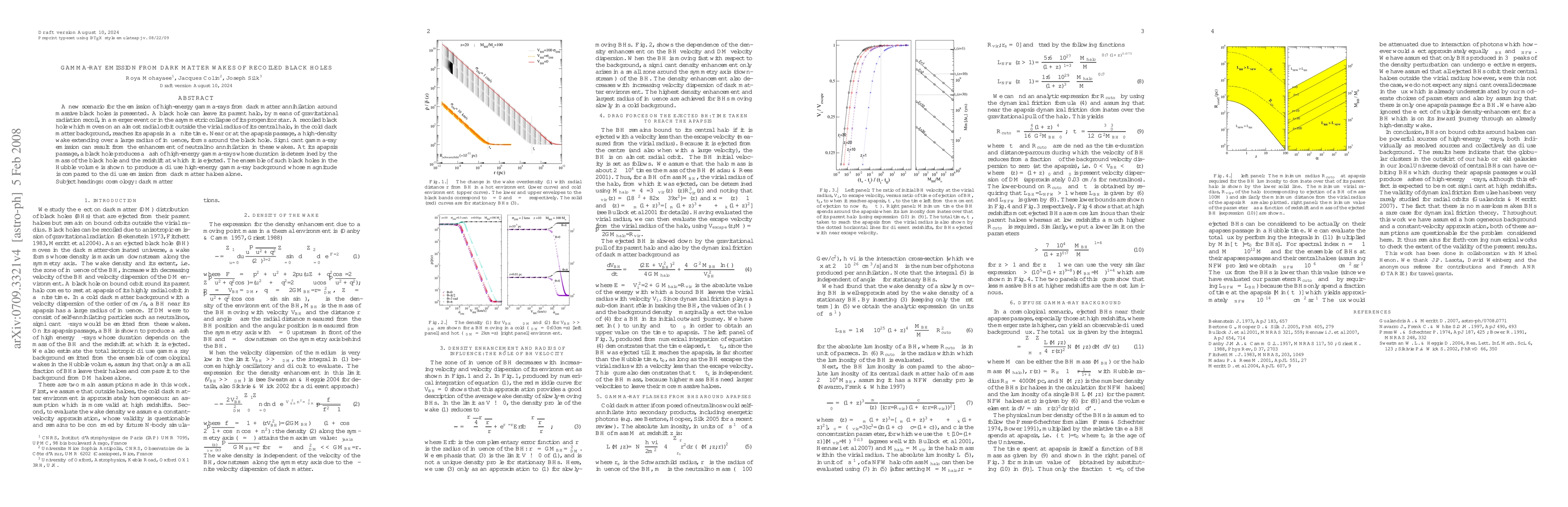 This paper proposes a new mechanism for high-energy gamma-ray emission from dark matter annihilation around recoiled black holes. These black holes, ejected by gravitational radiation, create dense wakes that enhance neutralino annihilation, leading to significant gamma-ray production, particularly at their apapsis.