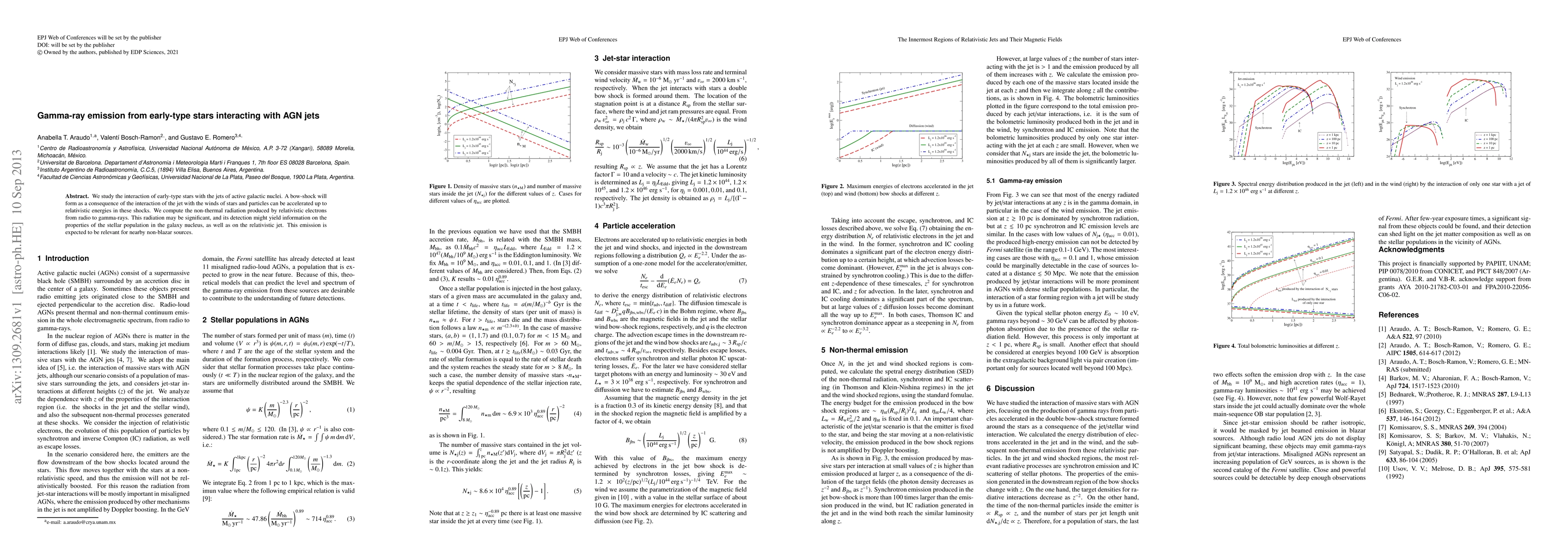 This study investigates the interaction of early-type stars with active galactic nucleus jets, predicting the formation of bow-shocks that can accelerate particles to relativistic speeds. The resulting non-thermal radiation from these relativistic electrons spans from radio to gamma-ray wavelengths, potentially providing insights into the stellar population and the jet's properties.