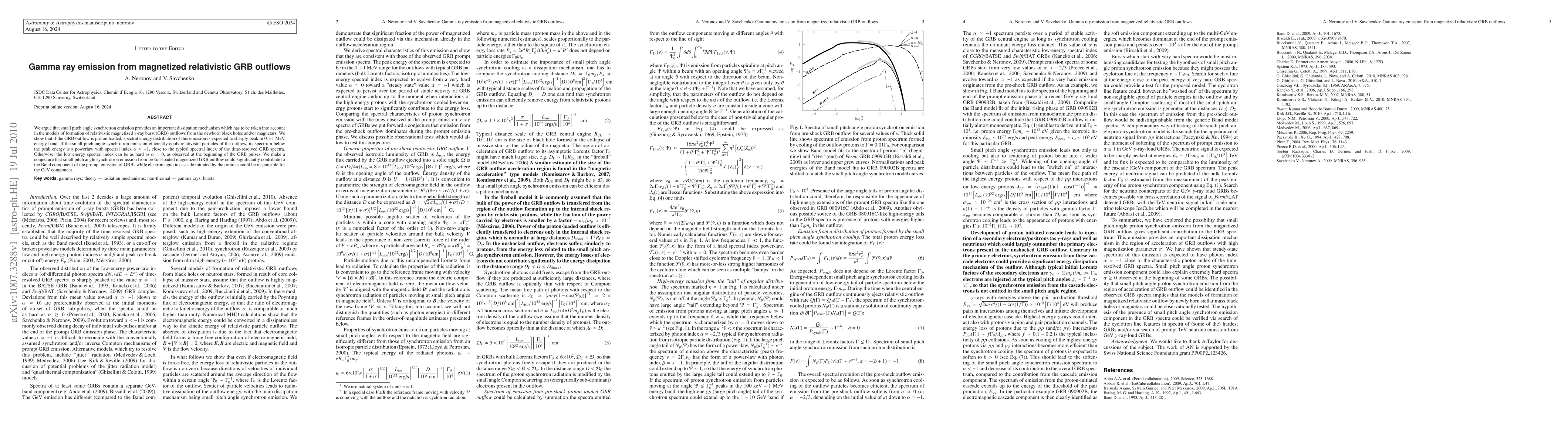 We argue that small pitch angle synchrotron emission provides an important dissipation mechanism which has to be taken into account in the models of formation of relativistic magnetized gamma-ray burst (GRB) outflows from the newborn black holes and/or magnetars. We show that if the GRB outflow is proton loaded, spectral energy distribution of this emission is expected to sharply peak in 0.1-1~MeV energy band. If the small pitch angle synchrotron emission efficiently cools relativistic particles of the outflow, its spectrum below the peak energy is a powerlaw with spectral index alpha ~ -1, close to the typical spectral index of the time-resolved GRB spectra. Otherwise, the low energy spectral index can be as hard as alpha ~ 0, as observed at the beginning of the GRB pulses. We make a conjecture that small pitch angle synchrotron emission from proton-loaded magnetized GRB outflow could significantly contribute to the Band component of the prompt emission of GRBs while electromagnetic cascade initiated by the protons could be responsible for the GeV component.