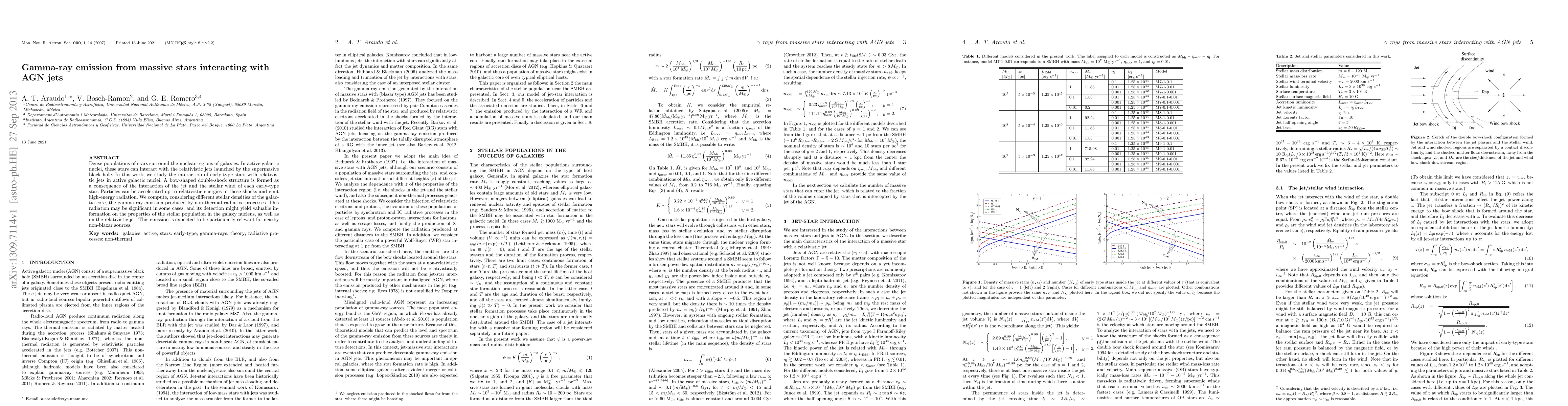 This paper investigates gamma-ray emission from massive stars interacting with relativistic jets in active galactic nuclei, finding that bow-shaped shock structures formed by these interactions can accelerate particles to relativistic energies, producing detectable gamma-ray radiation that provides insights into both the stellar population and the jet's properties.