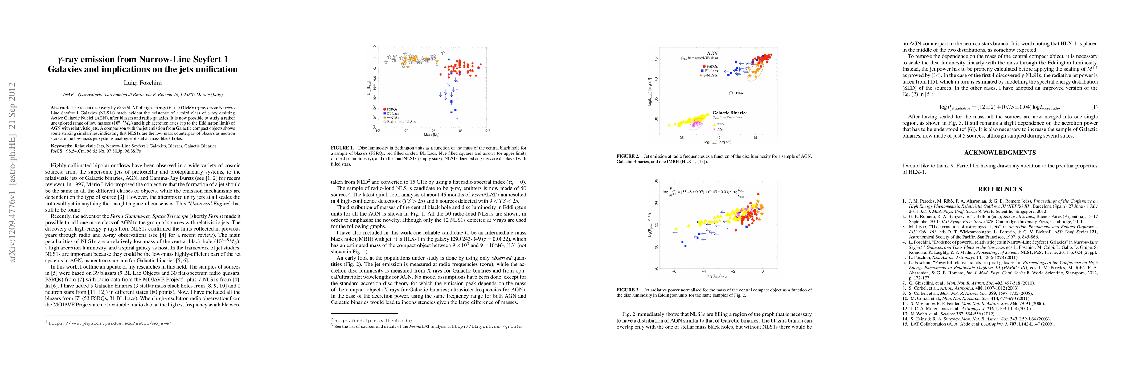 The paper discusses the discovery of high-energy gamma rays from Narrow-Line Seyfert 1 Galaxies (NLS1s) by Fermi/LAT, establishing them as a third class of gamma-ray emitting Active Galactic Nuclei (AGN). It suggests that NLS1s, with their low masses and high accretion rates, may unify with blazars, indicating a low-mass counterpart relationship similar to that between neutron stars and stellar mass black holes.