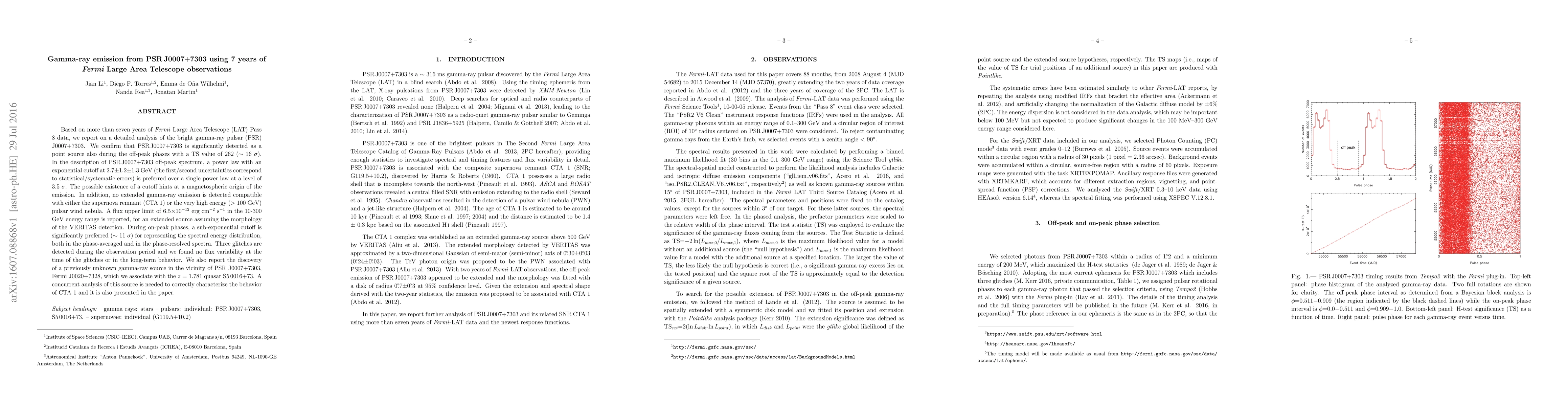 Based on more than seven years of Fermi Large Area Telescope (LAT) Pass 8 data, we report on a detailed analysis of the bright gamma-ray pulsar (PSR) J0007+7303. We confirm that PSR J0007+7303 is significantly detected as a point source also during the off-peak phases with a TS value of 262 ($\sim$ 16 $\sigma$). In the description of PSR J0007+7303 off-peak spectrum, a power law with an exponential cutoff at 2.7$\pm$1.2$\pm$1.3 GeV (the first/second uncertainties correspond to statistical/systematic errors) is preferred over a single power law at a level of 3.5 $\sigma$. The possible existence of a cutoff hints at a magnetospheric origin of the emission. In addition, no extended gamma-ray emission is detected compatible with either the supernova remnant (CTA 1) or the very high energy (> 100 GeV) pulsar wind nebula. A flux upper limit of 6.5$\times$10$^{-12}$ erg cm$^{-2}$ s$^{-1}$ in the 10-300 GeV energy range is reported, for an extended source assuming the morphology of the VERITAS detection. During on-peak phases, a sub-exponential cutoff is significantly preferred ($\sim$11 $\sigma$) for representing the spectral energy distribution, both in the phase-averaged and in the phase-resolved spectra. Three glitches are detected during the observation period and we found no flux variability at the time of the glitches or in the long-term behavior. We also report the discovery of a previously unknown gamma-ray source in the vicinity of PSR J0007+7303, Fermi J0020+7328, which we associate with the z = 1.781 quasar S5 0016+73. A concurrent analysis of this source is needed to correctly characterize the behavior of CTA 1 and it is also presented in the paper.