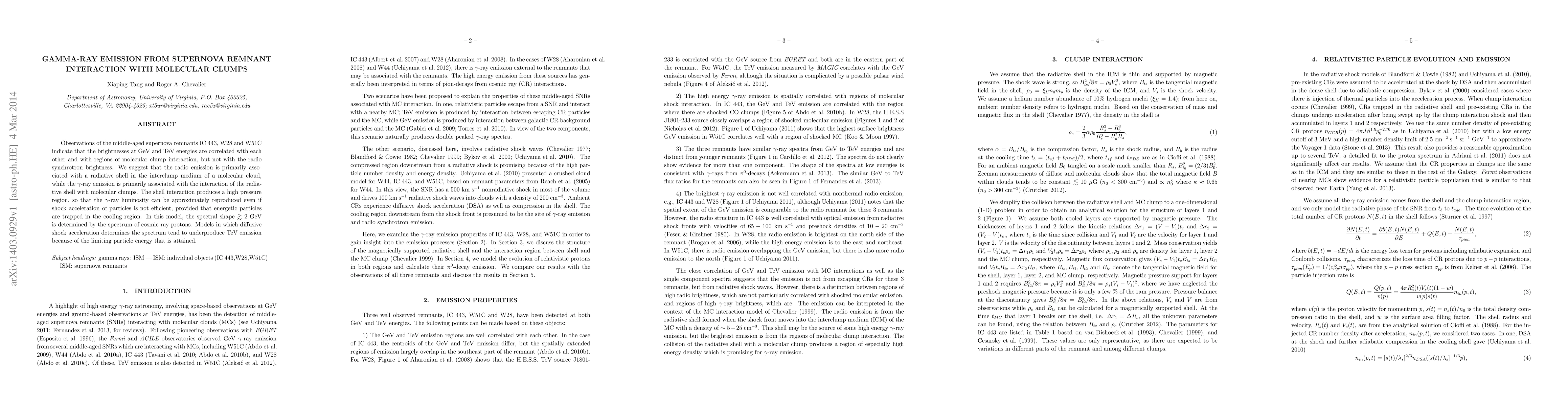 This paper investigates gamma-ray emissions from supernova remnants IC 443, W28, and W51C, finding a correlation with molecular clump interactions rather than radio synchrotron brightness. The gamma-ray emission is attributed to the interaction of a radiative shell with molecular clumps, suggesting that particle trapping in the cooling region is crucial for gamma-ray luminosity.