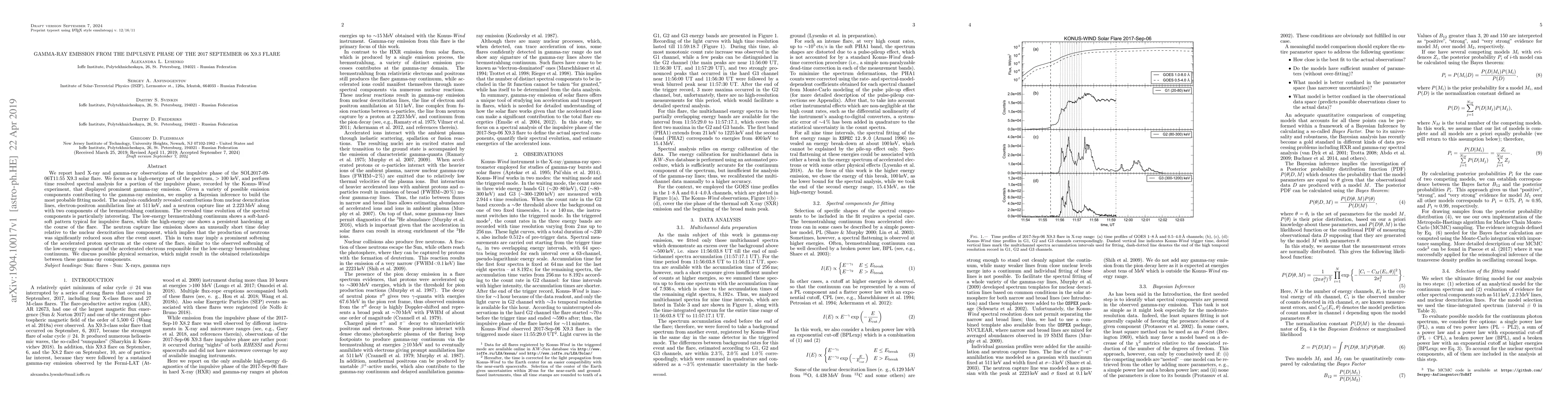 We report hard X-ray and gamma-ray observations of the impulsive phase of the SOL2017-09-06T11:55 X9.3 solar flare. We focus on a high-energy part of the spectrum, >100 keV, and perform time resolved spectral analysis for a portion of the impulsive phase, recorded by the Konus-Wind experiment, that displayed prominent gamma-ray emission. Given a variety of possible emission components contributing to the gamma-ray emission, we employ a Bayesian inference to build the most probable fitting model. The analysis confidently revealed contributions from nuclear deexcitation lines, electron-positron annihilation line at 511 keV, and a neutron capture line at 2.223 MeV along with two components of the bremsstrahlung continuum. The revealed time evolution of the spectral components is particularly interesting. The low-energy bremsstrahlung continuum shows a soft-hard-soft pattern typical for impulsive flares, while the high-energy one shows a persistent hardening at the course of the flare. The neutron capture line emission shows an unusually short time delay relative to the nuclear deexcitation line component, which implies that the production of neutrons was significantly reduced soon after the event onset. This in turn may imply a prominent softening of the accelerated proton spectrum at the course of the flare, similar to the observed softening of the low-energy component of the accelerated electrons responsible for the low-energy bremsstrahlung continuum. We discuss possible physical scenarios, which might result in the obtained relationships between these gamma-ray components.