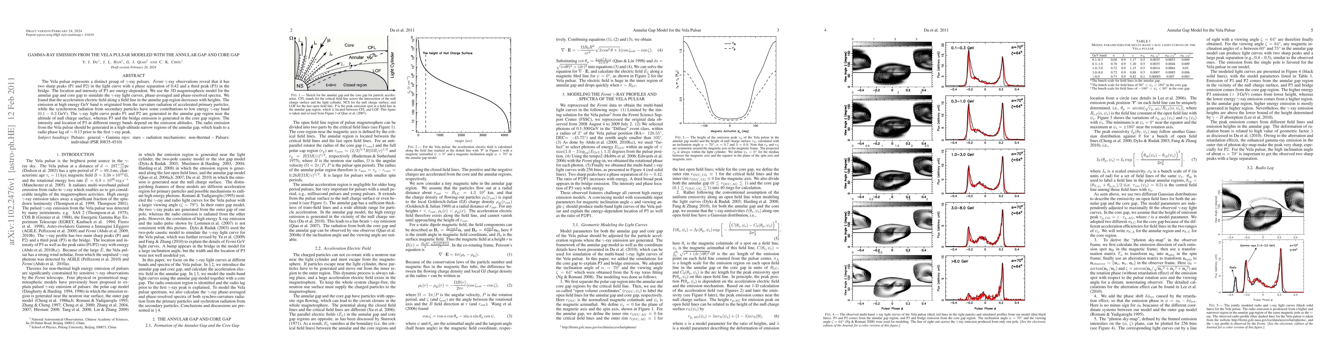 This paper models the gamma-ray emission from the Vela pulsar using a 3D magnetospheric model that incorporates both annular and core gaps. The study finds that P1 and P2 peaks originate from the annular gap, while P3 and bridge emission stem from the core gap, with energy-dependent intensity and location.