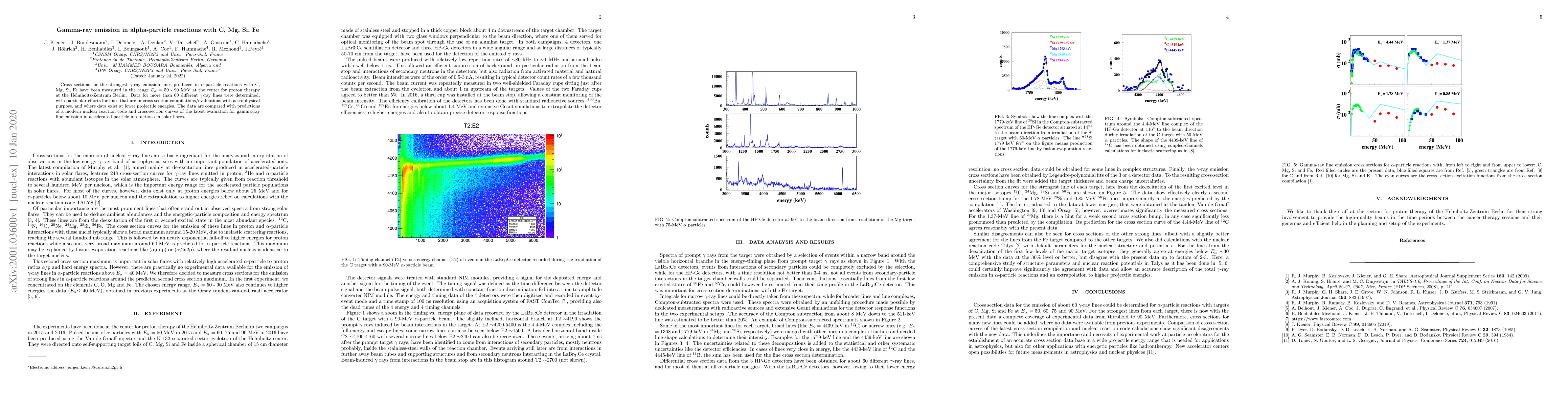 This study measures cross sections for gamma-ray emission lines from alpha-particle reactions with C, Mg, Si, and Fe at energies relevant for proton therapy. The findings compare experimental data with modern nuclear reaction models and previous evaluations, focusing on lines of astrophysical significance.