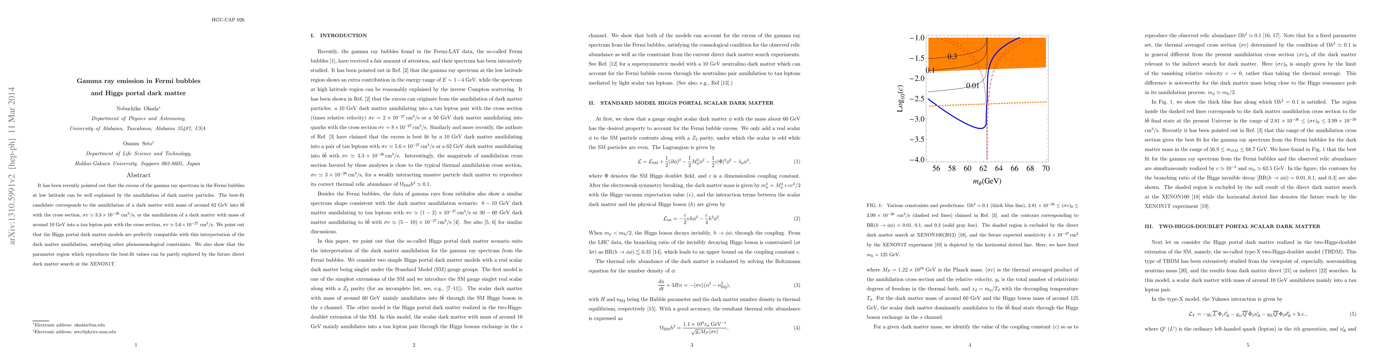 This paper explores the gamma ray emission in the Fermi Bubbles, suggesting that the observed excess can be explained by dark matter annihilation. It finds that Higgs portal dark matter models are compatible with the observed annihilation signatures, and notes that future direct detection experiments like XENON1T may probe the relevant parameter space.