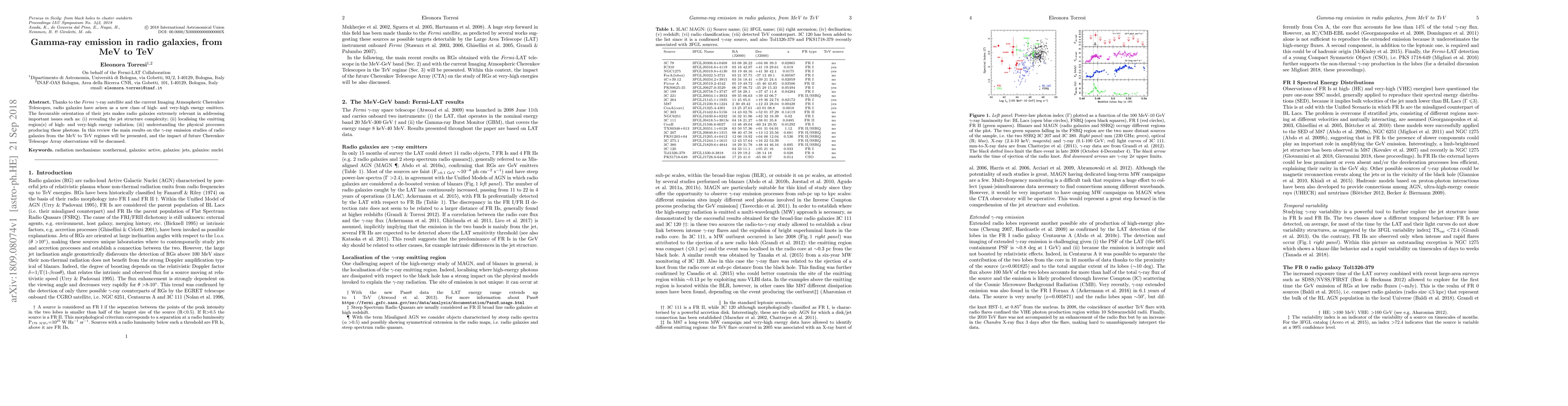 Radio galaxies emit gamma-rays across MeV to TeV regimes, revealing insights into jet structure and high-energy processes. Upcoming Cherenkov Telescope Array observations will further our understanding of these phenomena.