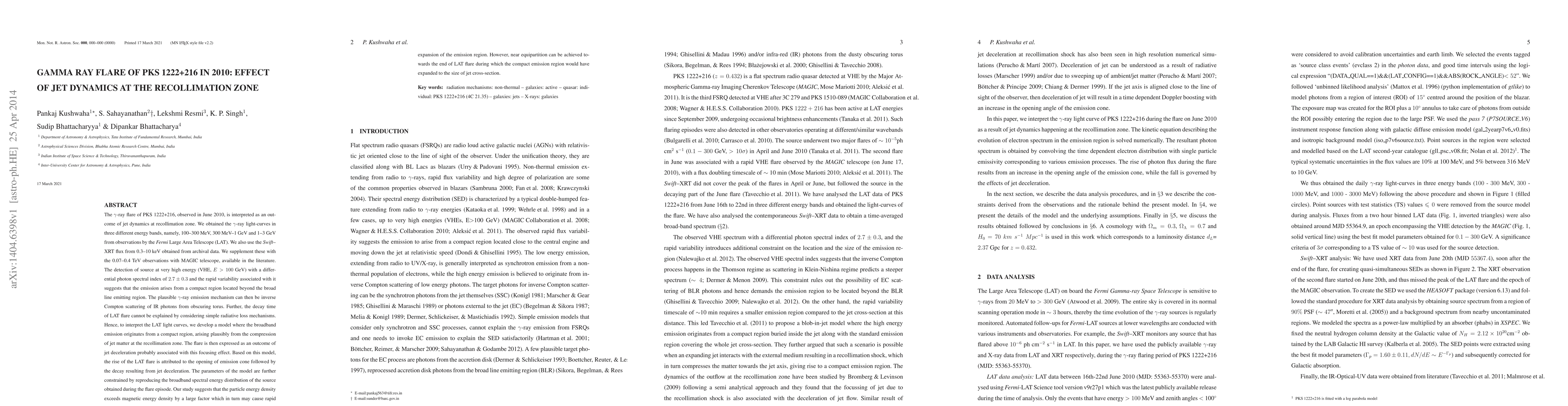 The $\gamma$-ray flare of PKS 1222+216, observed in June 2010, is interpreted as an outcome of jet dynamics at recollimation zone. We obtained the $\gamma$-ray light-curves in three different energy bands, namely, 100--300 MeV, 300 MeV--1 GeV and 1--3 GeV from observations by the \emph{Fermi} Large Area Telescope (LAT). We also use the \emph{Swift}--XRT flux from 0.3--10 keV obtained from archival data. We supplement these with the 0.07--0.4 TeV observations with MAGIC telescope, available in the literature. The detection of source at very high energy (VHE, $E>100$ GeV) with a differential photon spectral index of $2.7\pm0.3$ and the rapid variability associated with it suggests that the emission arises from a compact region located beyond the broad line emitting region. The plausible $\gamma$-ray emission mechanism can then be inverse Compton scattering of IR photons from obscuring torus. Further, the decay time of LAT flare cannot be explained by considering simple radiative loss mechanisms. Hence, to interpret the LAT light curves, we develop a model where the broadband emission originates from a compact region, arising plausibly from the compression of jet matter at the recollimation zone. The flare is then expressed as an outcome of jet deceleration probably associated with this focusing effect. The parameters of the model are further constrained by reproducing the broadband spectral energy distribution of the source obtained during the flare episode. Our study suggests that the particle energy density exceeds magnetic energy density by a large factor which in turn may cause rapid expansion of the emission region. However, near equipartition can be achieved towards the end of LAT flare during which the compact emission region would have expanded to the size of jet cross-section.