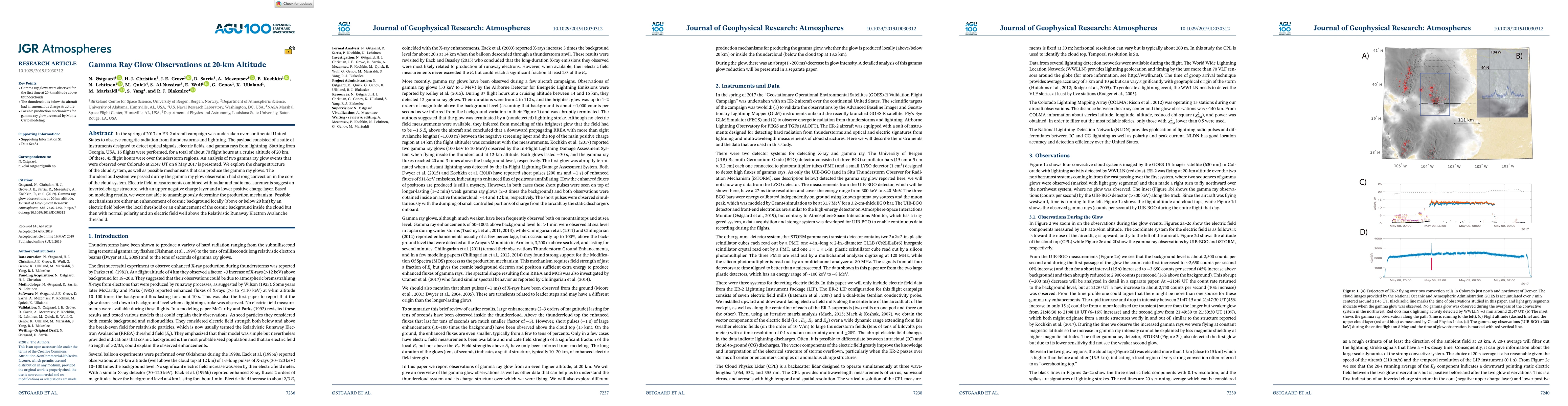 In 2017, an ER-2 aircraft campaign studied gamma ray glows from thunderstorms at 20-km altitude over US. Two events over Colorado revealed strong convection and an inverted charge structure (negative above, positive below). The production mechanism of these gamma ray glows remains unclear, with possibilities including cosmic ray enhancement due to electric fields or within the cloud itself.
