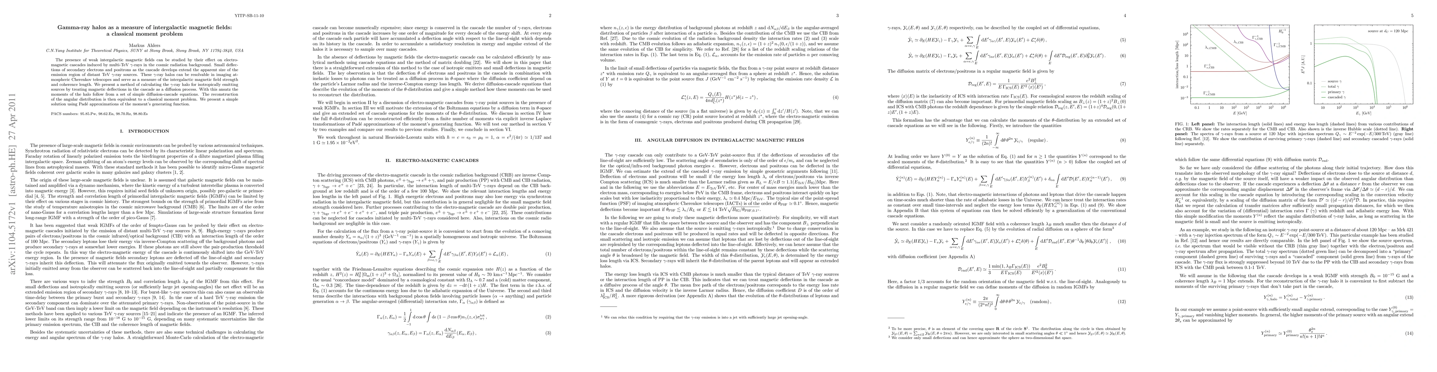 This paper investigates the use of gamma-ray halos to measure intergalactic magnetic fields by analyzing the deflection of secondary electrons and positrons from high-energy gamma-ray cascades. The authors propose a method to calculate these halos using diffusion-cascade equations and solve the problem using Pade approximations, providing a practical approach to infer magnetic field characteristics.