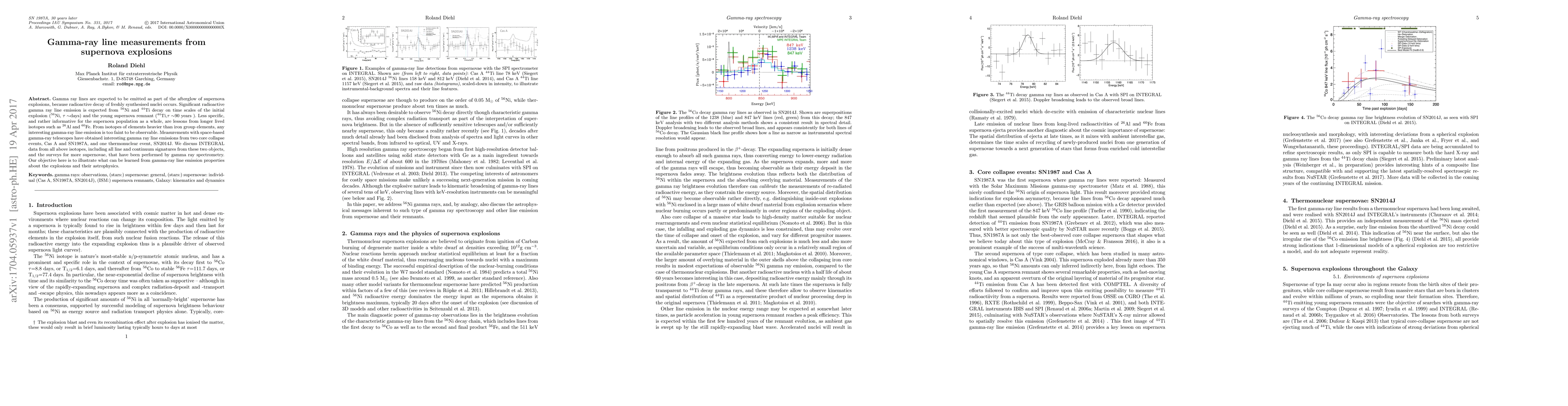 This paper analyzes gamma-ray line emissions from supernova explosions, focusing on the decay of radioactive isotopes like 56Ni, 44Ti, 26Al, and 60Fe. It highlights findings from space-based gamma-ray telescopes, particularly INTEGRAL data from events like Cas A, SN1987A, and SN2014J, to understand the astrophysical processes and characteristics of supernovae.