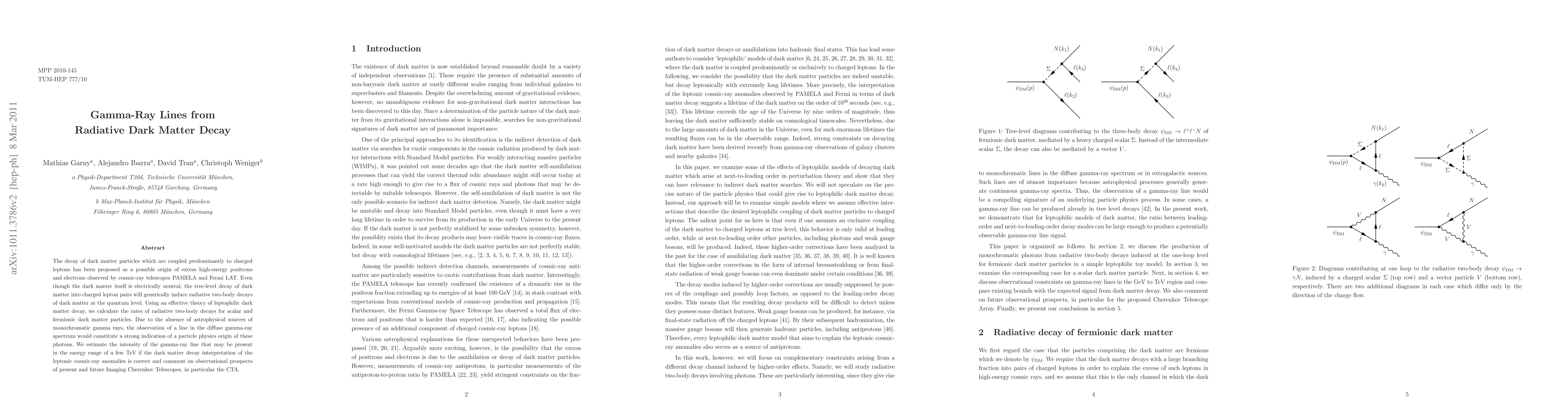 This paper investigates the radiative decay of dark matter particles into charged leptons, proposing it as a potential source of high-energy positrons and electrons observed by cosmic-ray telescopes. It estimates the intensity of gamma-ray lines in the TeV range, suggesting that their detection would confirm a particle physics origin, and discusses the observational prospects with current and future telescopes like the CTA.
