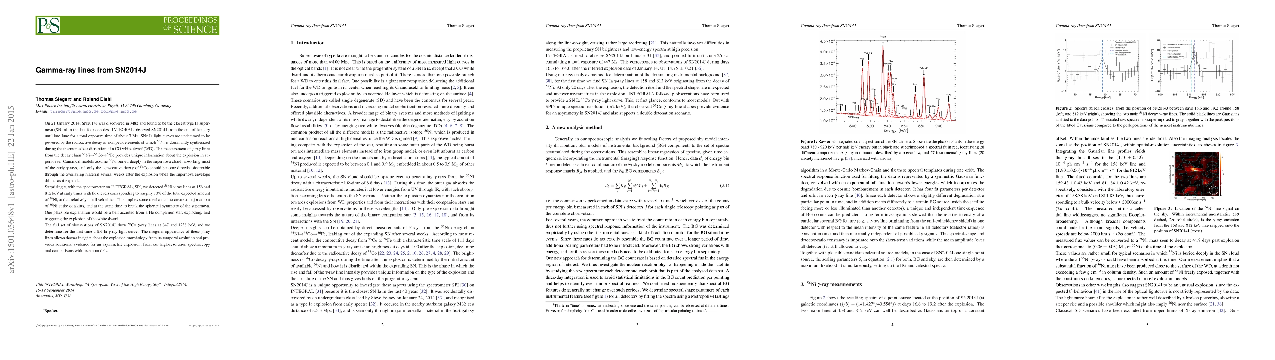 On 21 January 2014, SN2014J was discovered in M82 and found to be the closest type Ia supernova (SN Ia) in the last four decades. INTEGRAL observed SN2014J from the end of January until late June for a total exposure time of about 7 Ms. SNe Ia light curves are understood to be powered by the radioactive decay of iron peak elements of which $^{56}$Ni is dominantly synthesized during the thermonuclear disruption of a CO white dwarf (WD). The measurement of $\gamma$-ray lines from the decay chain $^{56}$Ni$\rightarrow$$^{56}$Co$\rightarrow$$^{56}$Fe provides unique information about the explosion in supernovae. Canonical models assume $^{56}$Ni buried deeply in the supernova cloud, absorbing most of the early $\gamma$-rays, and only the consecutive decay of $^{56}$Co should become directly observable through the overlaying material several weeks after the explosion when the supernova envelope dilutes as it expands. Surprisingly, with the spectrometer on INTEGRAL, SPI, we detected $^{56}$Ni $\gamma$-ray lines at 158 and 812 keV at early times with flux levels corresponding to roughly 10% of the total expected amount of $^{56}$Ni, and at relatively small velocities. This implies some mechanism to create a major amout of $^{56}$Ni at the outskirts, and at the same time to break the spherical symmetry of the supernova. One plausible explanation would be a belt accreted from a He companion star, exploding, and triggering the explosion of the white dwarf. The full set of observations of SN2014J show $^{56}$Co $\gamma$-ray lines at 847 and 1238 keV, and we determine for the first time a SN Ia $\gamma$-ray light curve. The irregular appearance of these $\gamma$-ray lines allows deeper insights about the explosion morphology from its temporal evolution and provides additional evidence for an asymmetric explosion, from our high-resolution spectroscopy and comparisons with recent models.