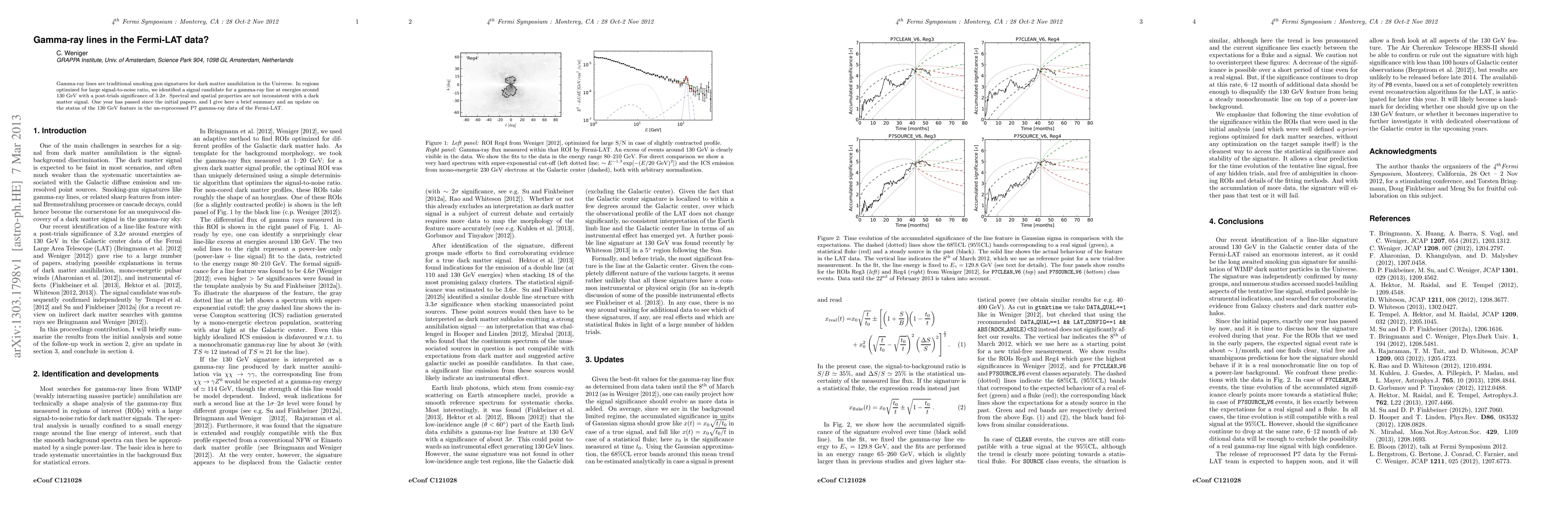 This paper reports a potential gamma-ray line at 130 GeV in Fermi-LAT data, suggesting a possible dark matter annihilation signal with a 3.2σ significance. The spectral and spatial properties align with dark matter expectations, though further analysis is needed.