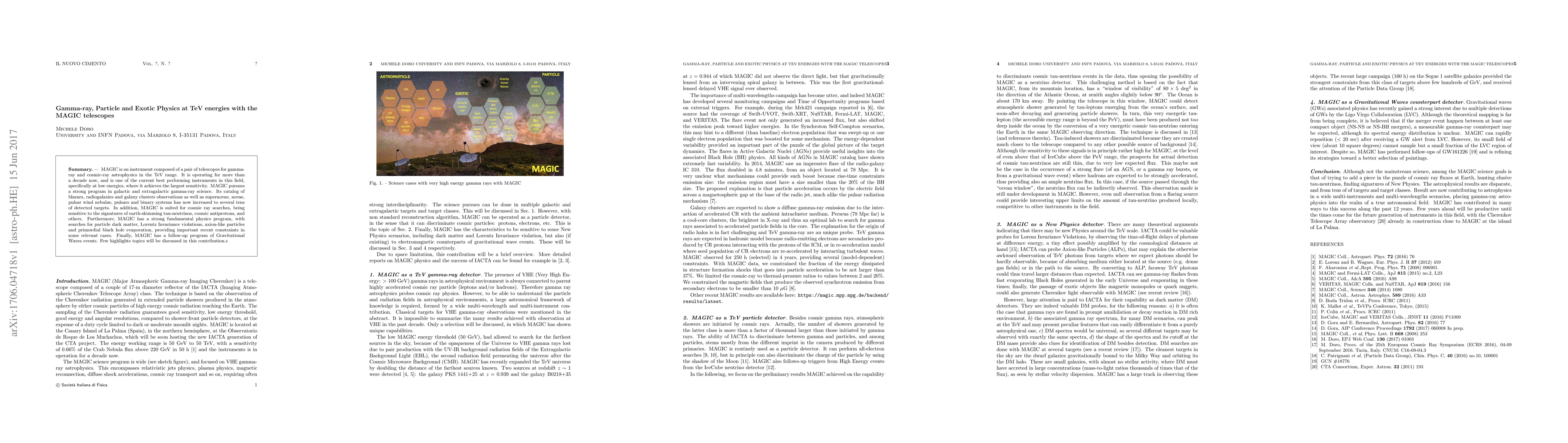 MAGIC is an instrument composed of a pair of telescopes for gamma- ray and cosmic-ray astrophysics in the TeV range. It is operating for more than a decade now, and is one of the current best performing instruments in this field, specifically at low energies, where it achieves the largest sensitivity. MAGIC pursues a strong program in galactic and extragalactic gamma-ray science. Its catalog of blazars, radiogalaxies and galaxy clusters observations as well as supernovae, novae, pulsar wind nebulae, pulsars and binary systems has now increased to several tens of detected targets. In addition, MAGIC is suited for cosmic ray searches, being sensitive to the signatures of earth-skimming tau-neutrinos, cosmic antiprotons, and others. Furthermore, MAGIC has a strong fundamental physics program, with searches for particle dark matter, Lorentz Invariance violations, axion-like particles and primordial black hole evaporation, providing important recent constraints in some relevant cases. Finally, MAGIC has a follow-up program of Gravitational Waves events. Few highlights topics will be discussed in this contribution.