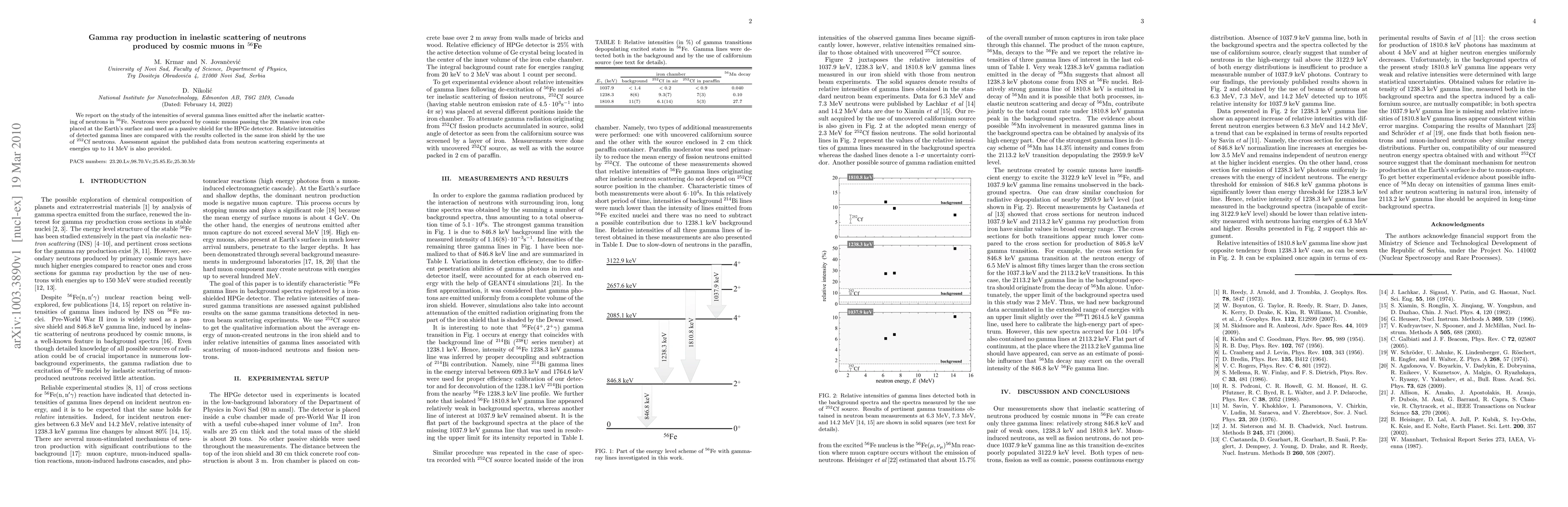 We report on the study of the intensities of several gamma lines emitted after the inelastic scattering of neutrons in $^{56}$Fe. Neutrons were produced by cosmic muons passing the 20t massive iron cube placed at the Earth's surface and used as a passive shield for the HPGe detector. Relative intensities of detected gamma lines are compared with the results collected in the same iron shield by the use of $^{252}$Cf neutrons. Assessment against the published data from neutron scattering experiments at energies up to 14 MeV is also provided.