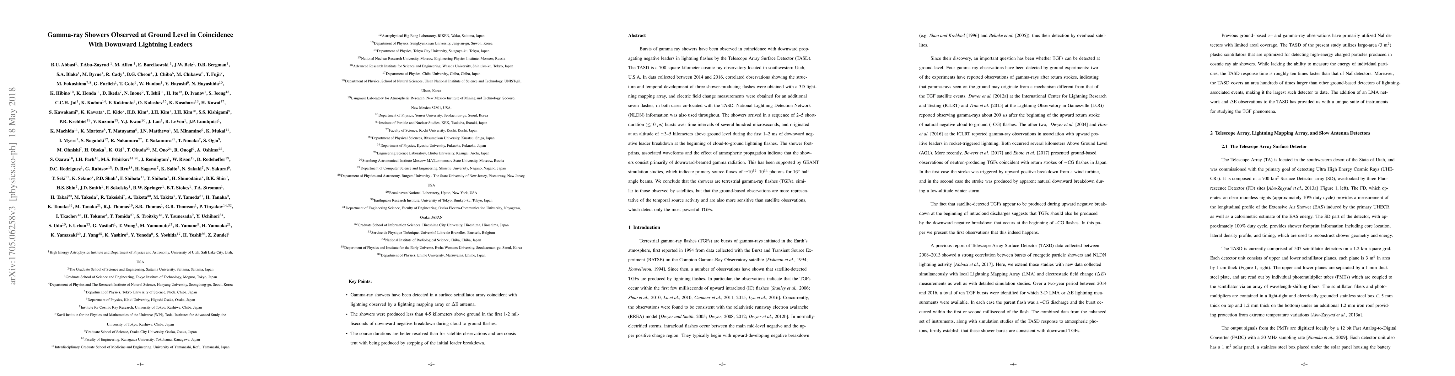 Telescope Array Surface Detector observations reveal gamma-ray showers coinciding with downward lightning leaders, indicating terrestrial gamma-ray flashes (TGFs) originating at 3-5 km altitude. Ground-based detections are more sensitive and representative of TGF temporal activity than satellite observations.