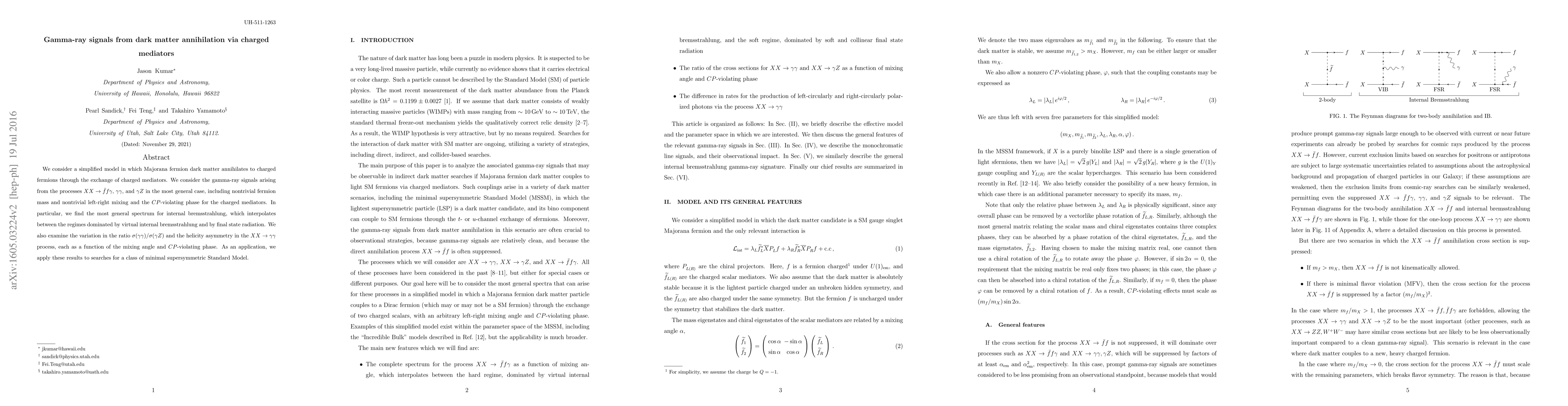 We consider a simplified model in which Majorana fermion dark matter annihilates to charged fermions through exchange of charged mediators. We consider the gamma-ray signals arising from the processes $XX \rightarrow \bar f f \gamma$, $\gamma \gamma$, and $\gamma Z$ in the most general case, including non-trivial fermion mass and non-trivial left-right mixing and $CP$-violating phase for the charged mediators. In particular, we find the most general spectrum for internal bremsstrahlung, which interpolates between the regimes dominated by virtual internal bremsstrahlung and by final state radiation. We also examine the variation in the ratio $\sigma(\gamma \gamma) / \sigma (\gamma Z)$ and the helicity asymmetry in the $XX \rightarrow \gamma \gamma$ process, each as a function of mixing angle and $CP$-violating phase. As an application, we apply these results to searches for a class of MSSM models.