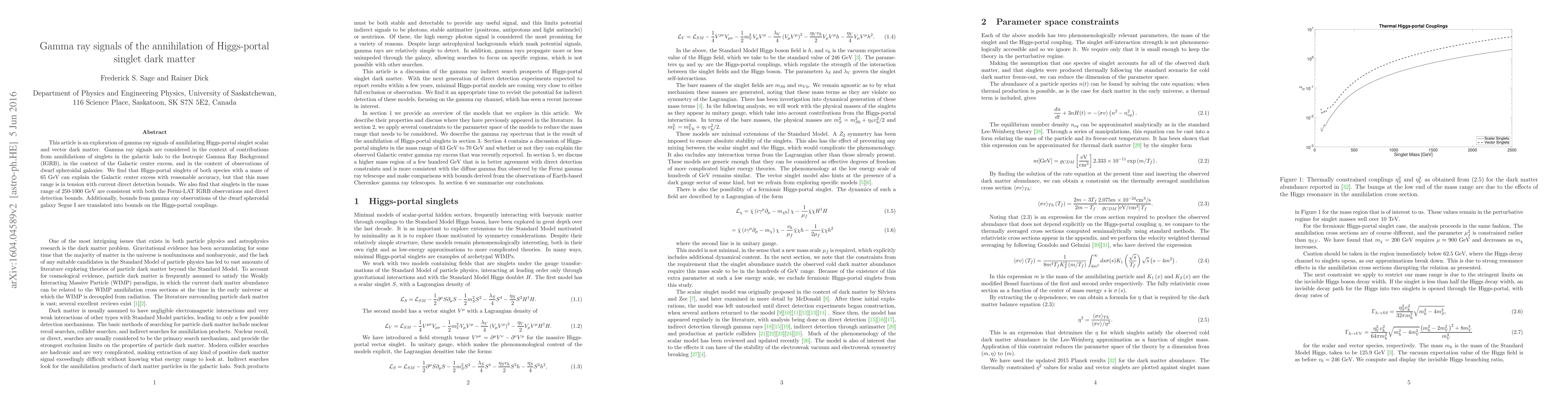 This paper investigates gamma ray signals from Higgs-portal singlet dark matter annihilation, finding that 65 GeV singlets can explain the Galactic center excess but conflict with direct detection limits. It also shows that 250-1000 GeV singlets fit both Fermi-LAT IGRB observations and direct detection constraints, while gamma ray observations of Segue I provide bounds on the Higgs-portal coupling.