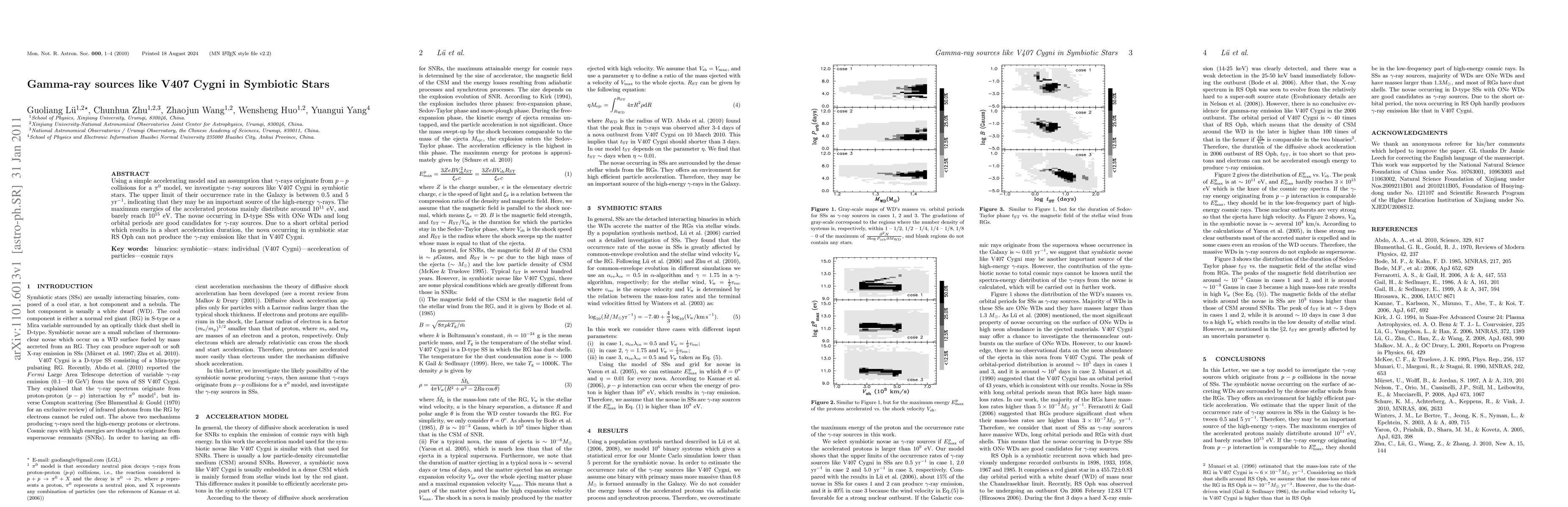 This paper investigates $\gamma$-ray sources in symbiotic stars, particularly V407 Cygni, using a simple accelerating model. It finds that these sources may contribute significantly to high-energy $\gamma$-rays in the Galaxy, with maximum proton energies around $10^{11}$ eV.