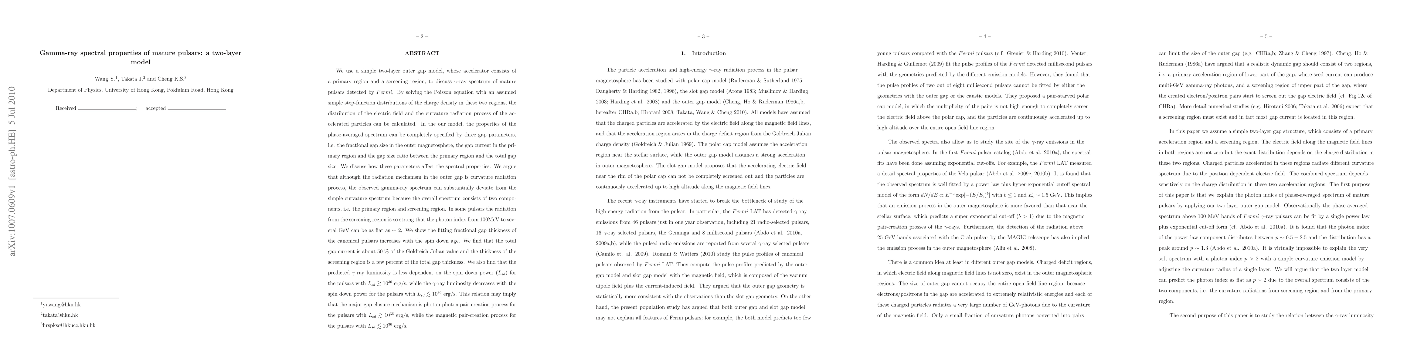 This paper proposes a two-layer outer gap model to explain the gamma-ray spectrum of mature pulsars observed by Fermi. The model, consisting of primary and screening regions, reveals that the spectrum is influenced by three gap parameters, leading to a complex gamma-ray spectrum due to contributions from both regions. The study shows that the gamma-ray luminosity is less dependent on spin down power for pulsars with high spin down power.