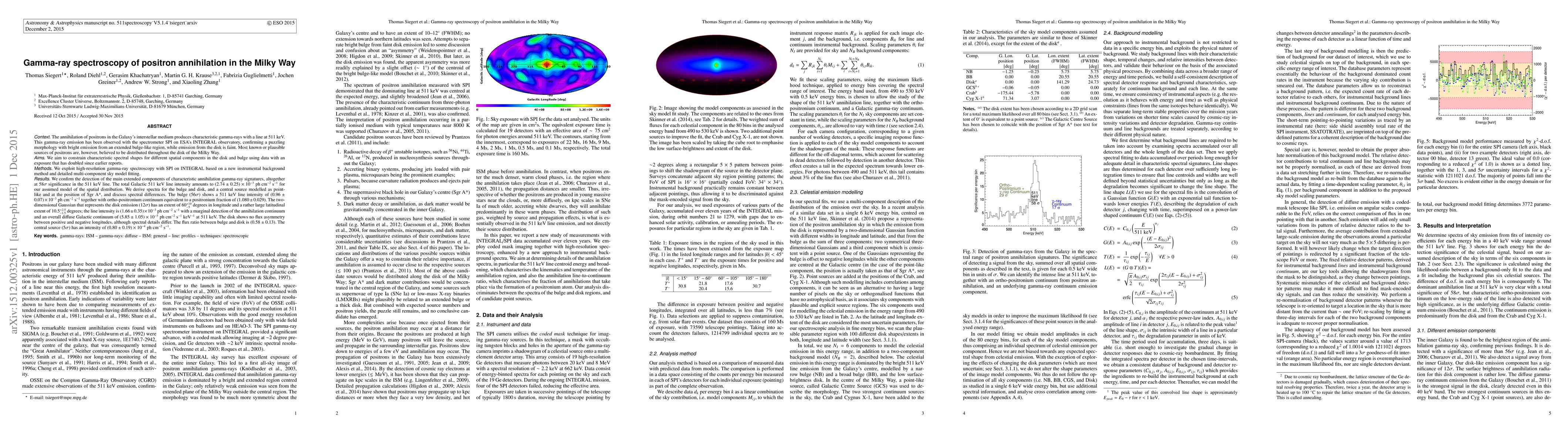 The annihilation of positrons in the Galaxy's interstellar medium produces characteristic gamma-rays with a line at 511 keV. This emission has been observed with the spectrometer SPI on INTEGRAL, confirming a puzzling morphology with bright emission from an extended bulge-like region, and faint disk emission. Most plausible sources of positrons are believed to be distributed throughout the disk of the Galaxy. We aim to constrain characteristic spectral shapes for different spatial components in the disk and bulge with the high-resolution gamma-ray spectrometer SPI, based on a new instrumental background method and detailed multi-component sky model fitting. We confirm the detection of the main extended components of characteristic annihilation gamma-ray signatures at 58$\sigma$ significance in the line. The total Galactic line intensity amounts to $(2.7\pm0.3)\times10^{-3}~\mathrm{ph~cm^{-2}~s^{-1}}$ for our assumed spatial model. We derive spectra for the bulge and disk, and a central point-like and at the position of Sgr A*, and discuss spectral differences. The bulge shows a 511 keV line intensity of $(0.96\pm0.07)\times10^{-3}~\mathrm{ph~cm^{-2}~s^{-1}}$ and an ortho-positronium continuum equivalent to a positronium fraction of ($1.08\pm0.03$). The 2D-Gaussian representing the disk has an extent of $60^{+10}_{-5}$ deg in longitude and a latitudinal extent of $10.5^{+2.5}_{-1.5}$ deg; the line intensity is $(1.7\pm0.4)\times10^{-3}~\mathrm{ph~cm^{-2}~s^{-1}}$ with a marginal detection of ortho-positronium and an overall diffuse Galactic continuum of $(5.85\pm1.05)\times10^{-5}~\mathrm{ph~cm^{-2}~s^{-1}~keV^{-1}}$ at 511 keV. The disk shows no flux asymmetry between positive and negative longitudes, although spectral details differ. The flux ratio between bulge and disk is ($0.6\pm0.1$). The central source has an intensity of $(0.8\pm0.2)\times10^{-4}~\mathrm{ph~cm^{-2}~s^{-1}}$.