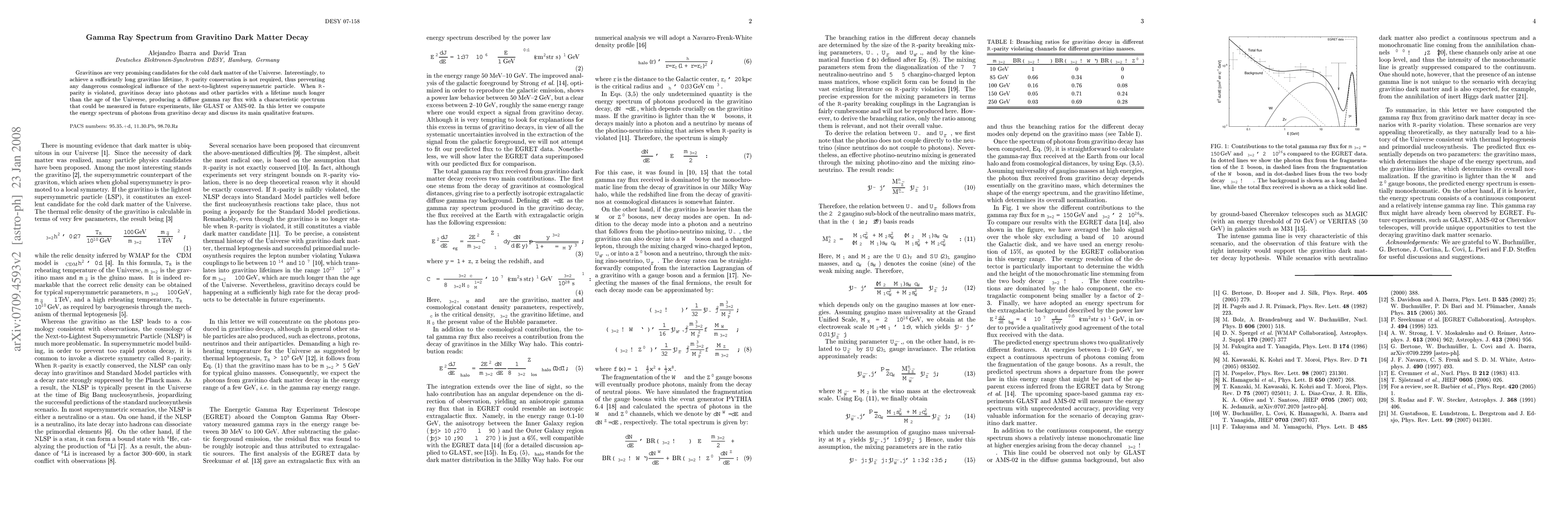 This paper computes the gamma ray spectrum resulting from gravitino decay, a potential cold dark matter candidate, when R-parity is violated. The study highlights the characteristic spectrum of photons produced, which could be detected by future experiments like GLAST or AMS-02.