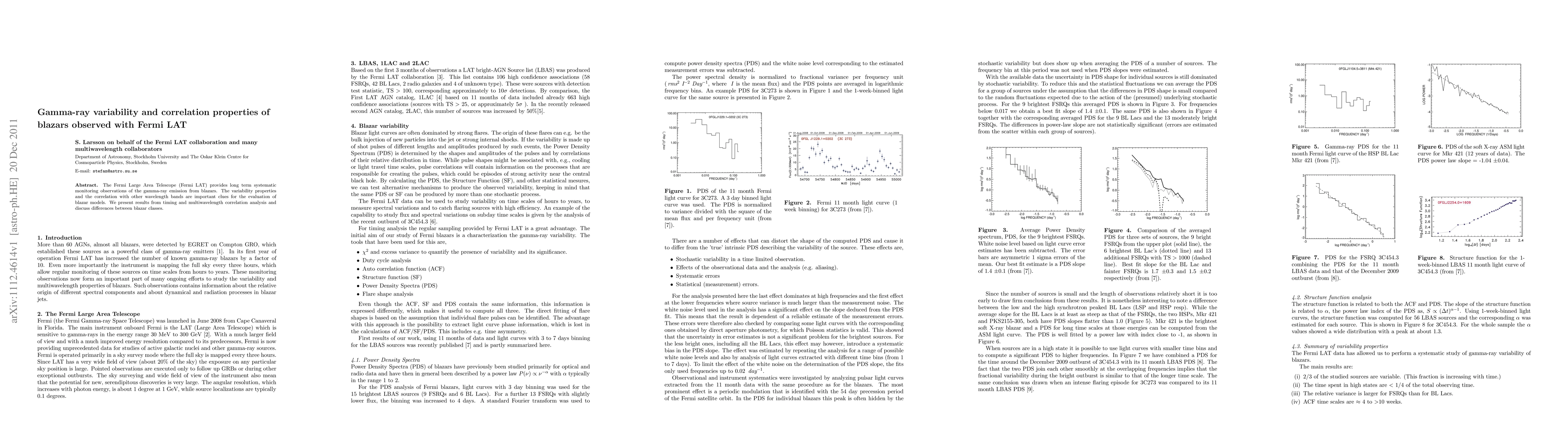 The Fermi LAT monitors gamma-ray emissions from blazars, revealing variability and multiwavelength correlation properties. The study highlights differences in these properties among various blazar classes, aiding in the evaluation of blazar models.