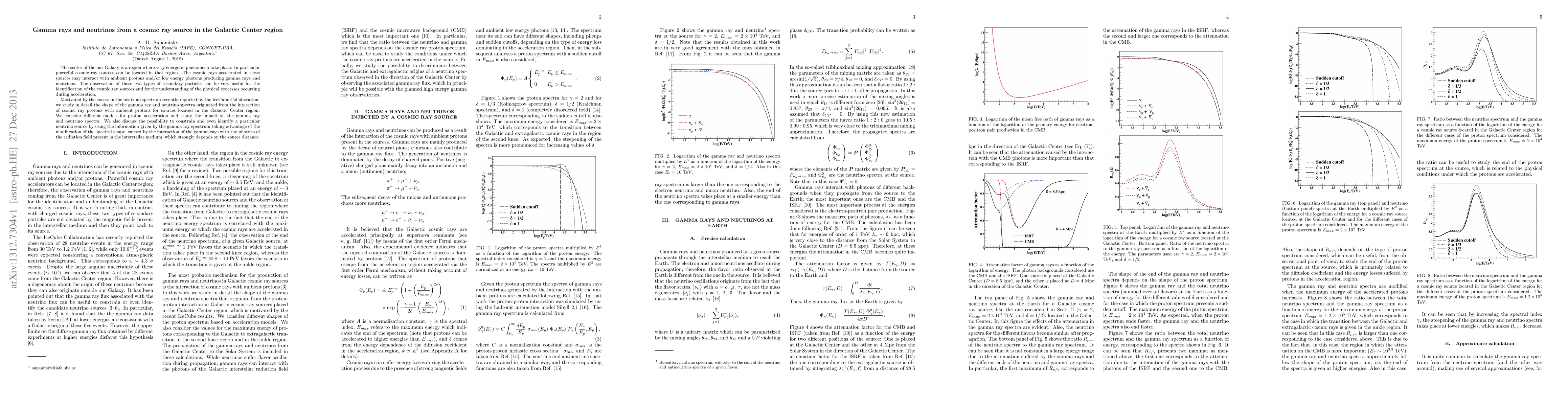 This paper investigates gamma rays and neutrinos from cosmic ray sources in the Galactic Center, focusing on their interaction with ambient particles. The study aims to identify cosmic ray sources and understand acceleration processes, using the observed neutrino excess and modeling gamma ray and neutrino spectra to potentially pinpoint specific neutrino sources.