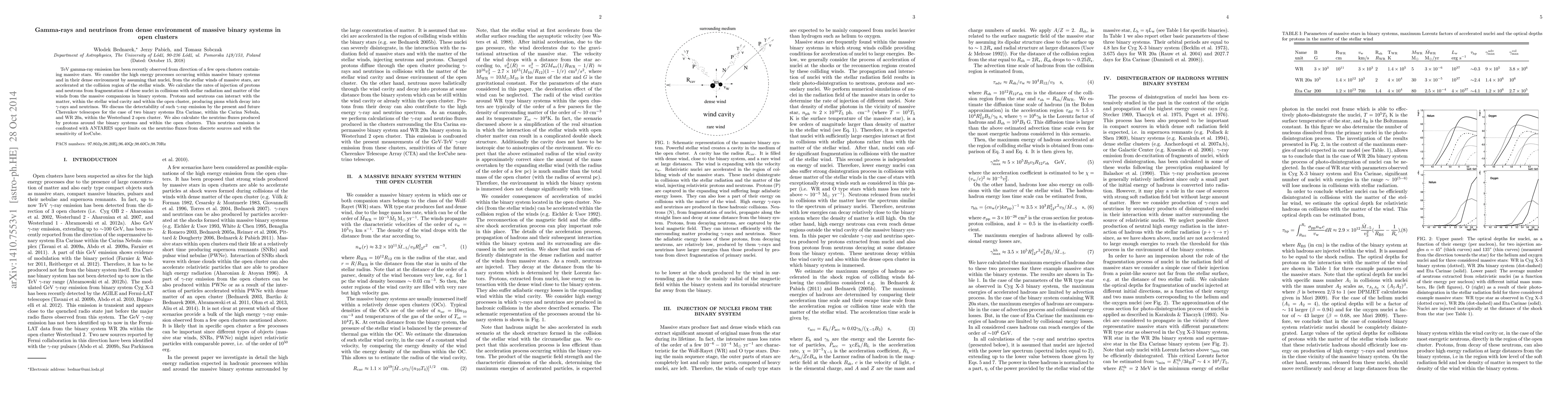 TeV gamma-ray emission has been recently observed from direction of a few open clusters containing massive stars. We consider the high energy processes occurring within massive binary systems and in their dense environment by assuming that nuclei, from the stellar winds of massive stars, are accelerated at the collision region of the stellar winds. We calculate the rates of injection of protons and neutrons from fragmentation of these nuclei in collisions with stellar radiation and matter of the winds from the massive companions in binary system. Protons and neutrons can interact with the matter, within the stellar wind cavity and within the open cluster, producing pions which decay into $\gamma$-rays and neutrinos. We discuss the detectability of such $\gamma$-ray emission by the present and future Cherenkov telescopes for the case of two binary systems Eta Carinae, within the Carina Nebula, and WR 20a, within the Westerlund 2 open cluster. We also calculate the neutrino fluxes produced by protons around the binary systems and within the open clusters. This neutrino emission is confronted with ANTARES upper limits on the neutrino fluxes from discrete sources and with the sensitivity of IceCube.