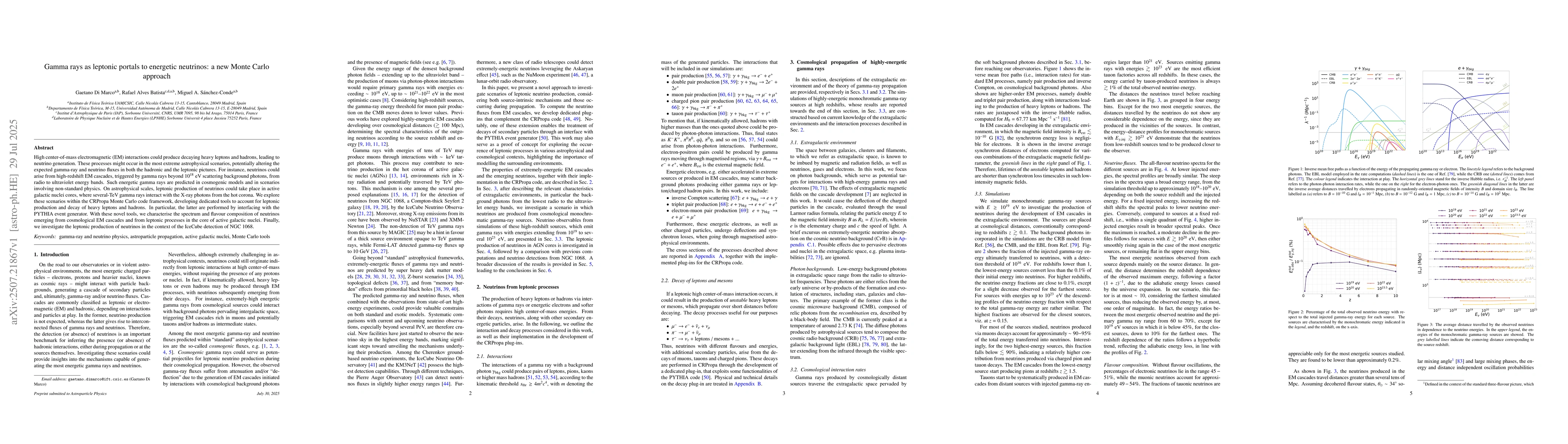 High center-of-mass electromagnetic~(EM) interactions could produce decaying heavy leptons and hadrons, leading to neutrino generation. These processes might occur in the most extreme astrophysical scenarios, potentially altering the expected gamma-ray and neutrino fluxes in both the hadronic and the leptonic pictures. For instance, neutrinos could arise from high-redshift EM cascades, triggered by gamma rays beyond $10^{18} \; \text{eV}$ scattering background photons, from radio to ultraviolet energy bands. Such energetic gamma rays are predicted in cosmogenic models and in scenarios involving non-standard physics. On astrophysical scales, leptonic production of neutrinos could take place in active galactic nuclei cores, where several-TeV gamma rays interact with the X-ray photons from the hot corona. We explore these scenarios within the CRPropa Monte Carlo code framework, developing dedicated tools to account for leptonic production and decay of heavy leptons and hadrons. In particular, the latter are performed by interfacing with the PYTHIA event generator. With these novel tools, we characterise the spectrum and flavour composition of neutrinos emerging from cosmological EM cascades and from leptonic processes in the core of active galactic nuclei. Finally, we investigate the leptonic production of neutrinos in the context of the IceCube detection of NGC~1068.