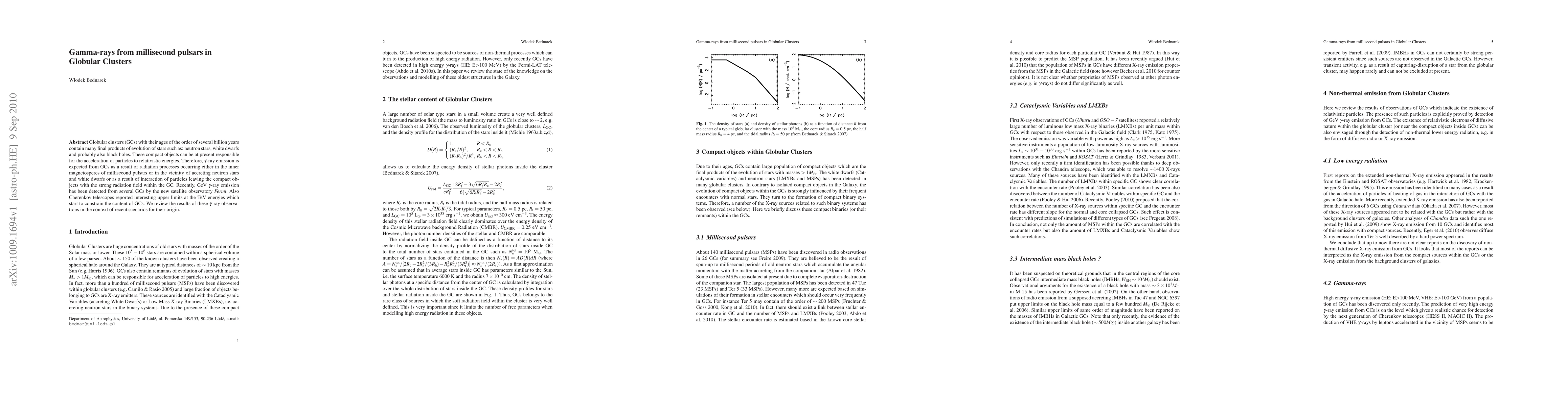 This paper reviews gamma-ray emissions from globular clusters, focusing on the potential sources such as millisecond pulsars and accreting neutron stars, and discusses recent detections by the Fermi satellite and upper limits from Cherenkov telescopes, providing insights into the particle acceleration processes within these ancient stellar environments.