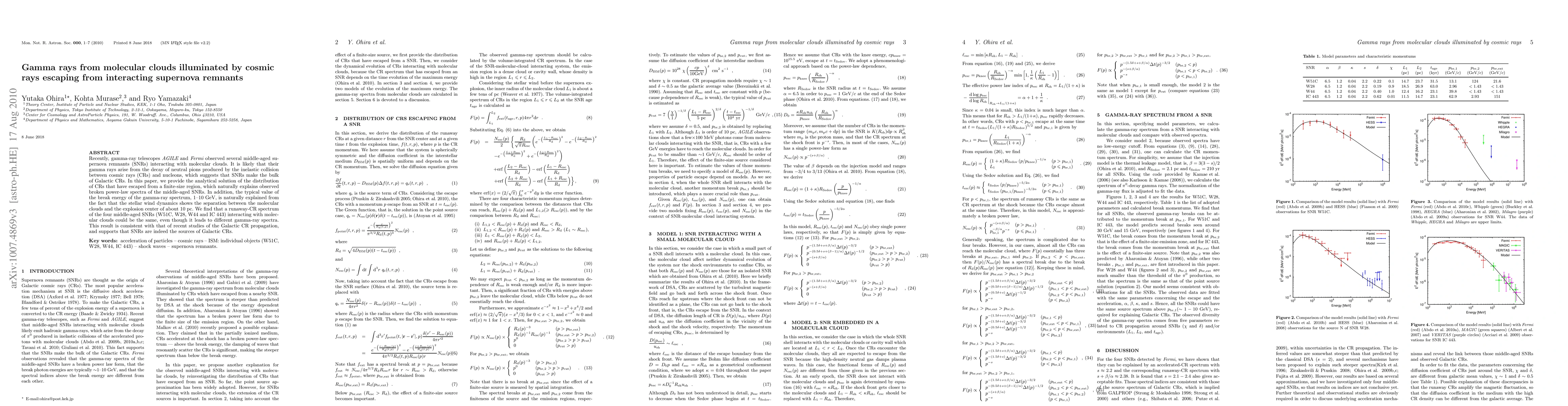 This paper analyzes gamma rays from supernova remnants interacting with molecular clouds, attributing them to cosmic rays produced by these remnants. The study provides an analytical solution explaining the observed gamma-ray spectra and supports the theory that supernova remnants are the primary sources of Galactic cosmic rays.
