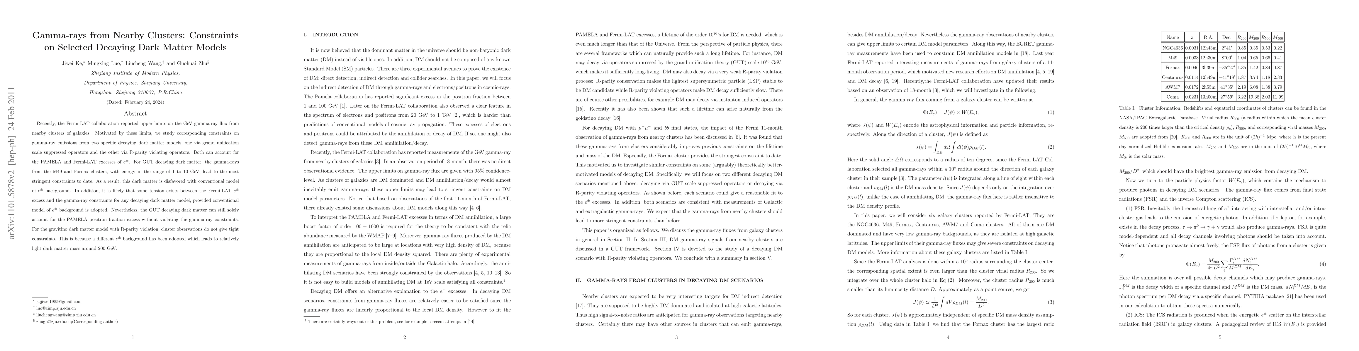 This paper examines constraints on two specific decaying dark matter models using gamma-ray data from nearby galaxy clusters. The study finds stringent constraints on grand unification scale decaying dark matter, disfavoring it under conventional positron background models, while the R-parity violating gravitino model remains less constrained.