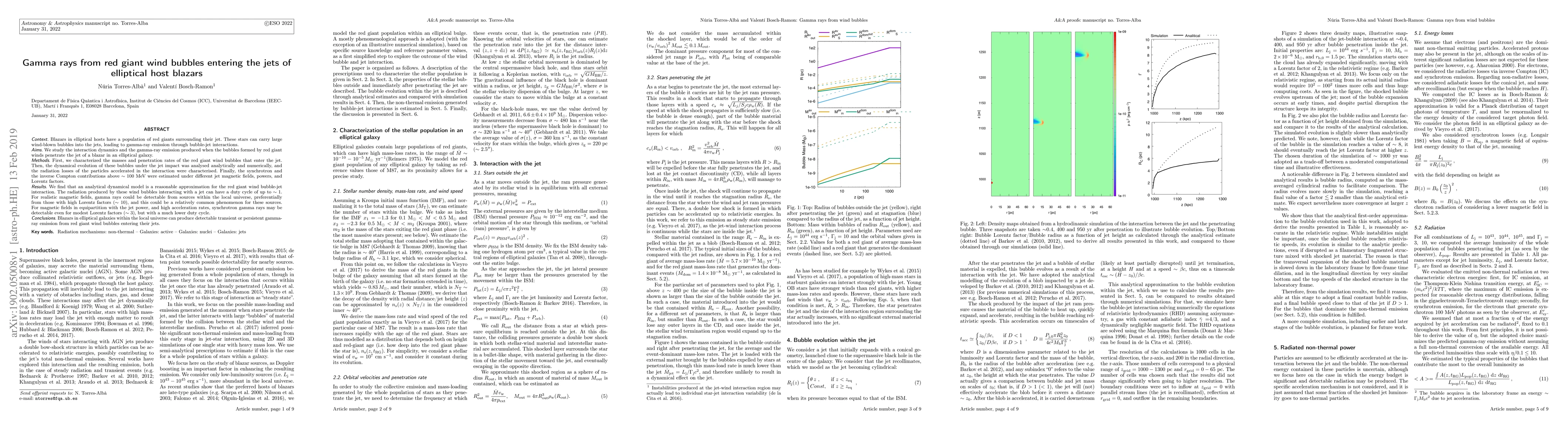 Blazars in elliptical hosts have a population of red giants surrounding their jet. These stars can carry large wind-blown bubbles into the jets, leading to gamma-ray emission through bubble-jet interactions. We study the interaction dynamics and the gamma-ray emission produced when the bubbles formed by red giant winds penetrate the jet of a blazar in an elliptical galaxy. First, we characterized the masses and penetration rates of the red giant wind bubbles that enter the jet. Then, the dynamical evolution of these bubbles under the jet impact was analysed analytically and numerically, and the radiation losses of the particles accelerated in the interaction were characterised. Finally, the synchrotron and the inverse Compton contributions above 100 MeV were estimated under different jet magnetic fields, powers, and Lorentz factors. We find that an analytical dynamical model is a reasonable approximation for the red giant wind bubble-jet interaction. The radiation produced by these wind bubbles interacting with a jet can have a duty cycle of up to 1. For realistic magnetic fields, gamma rays could be detectable from sources within the local universe, preferentially from those with high Lorentz factors (of about 10), and this could be a relatively common phenomenon for these sources. For magnetic fields in equipartition with the jet power, and high acceleration rates, synchrotron gamma rays may be detectable even for modest Lorentz factors (of about 3), but with a much lower duty cycle.