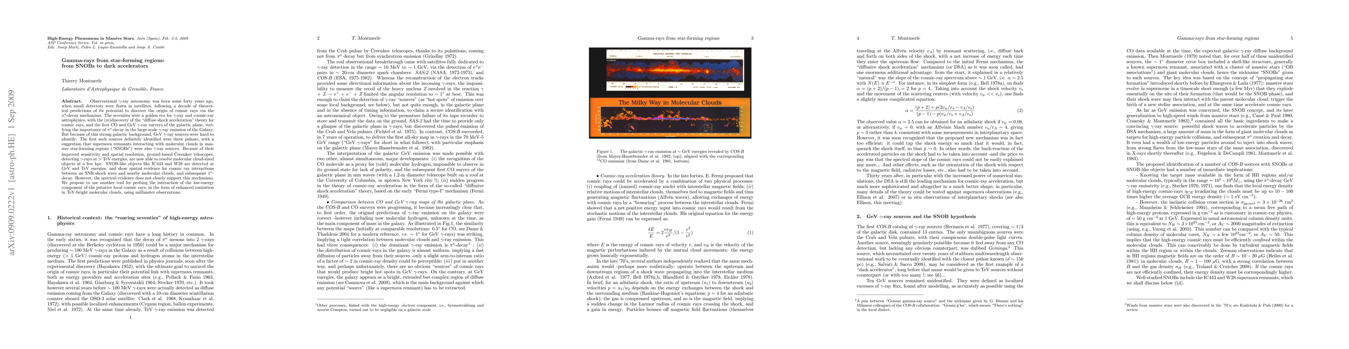 Observational gamma-ray astronomy was born some forty years ago, when small detectors were flown in satellites, following a decade of theoretical predictions of its potential to discover the origin of cosmic rays via the pi-zero decay mechanism. The seventies were a golden era for gamma-ray and cosmic-ray astrophysics, with the (re)discovery of the "diffuse shock acceleration" theory for cosmic rays, and the first CO and GeV gamma-ray surveys of the galactic plane, verifying the importance of pi-zero decay in the large-scale gamma-ray emission of the Galaxy. But because of this strong galactic background, GeV gamma-ray sources were hard to identify. The first such sources definitely identified were three pulsars, with a suggestion that supernova remnants interacting with molecular clouds in massive star-forming regions ("SNOBs") were also gamma-ray sources. Because of their improved sensitivity and spatial resolution, ground-based Cerenkov telescopes, detecting gamma-rays at > TeV energies, are now able to resolve molecular cloud-sized objects at a few kpc. SNOB-like objects like IC443 and W28 are detected at GeV and TeV energies, and show spatial evidence for cosmic-ray interactions between an SNR shock wave and nearby molecular clouds, and subsequent pi-zero decay. However, the spectral evidence does not clearly support this mechanism. We propose to use another tool for probing the interaction of the low-energy component of the putative local cosmic rays, in the form of enhanced ionization in TeV-bright molecular clouds, using millimeter observations.