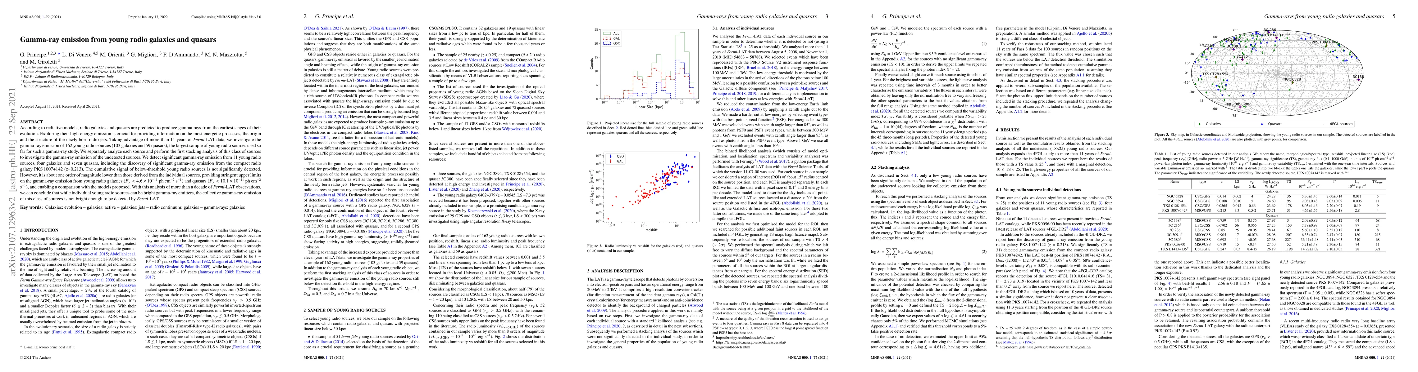 This study investigates gamma-ray emission from young radio galaxies and quasars, detecting significant emissions from 11 sources, including a compact radio galaxy, and finding that the collective emission is too faint to be detected by Fermi-LAT.