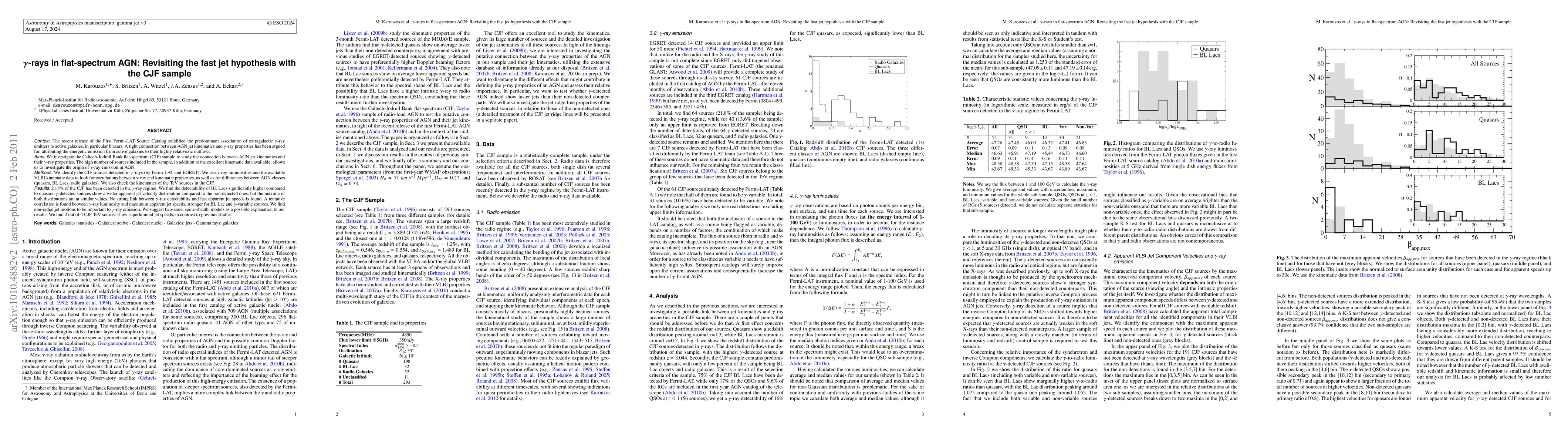 This paper investigates the Caltech-Jodrell Bank flat-spectrum (CJF) sample to explore the relationship between gamma-ray emissions and jet kinematics in active galactic nuclei (AGN). The study finds no strong correlation between gamma-ray detectability and fast apparent jet speeds but suggests that non-radial jet motions and two-zone spine-sheath models may explain the observed gamma-ray properties.