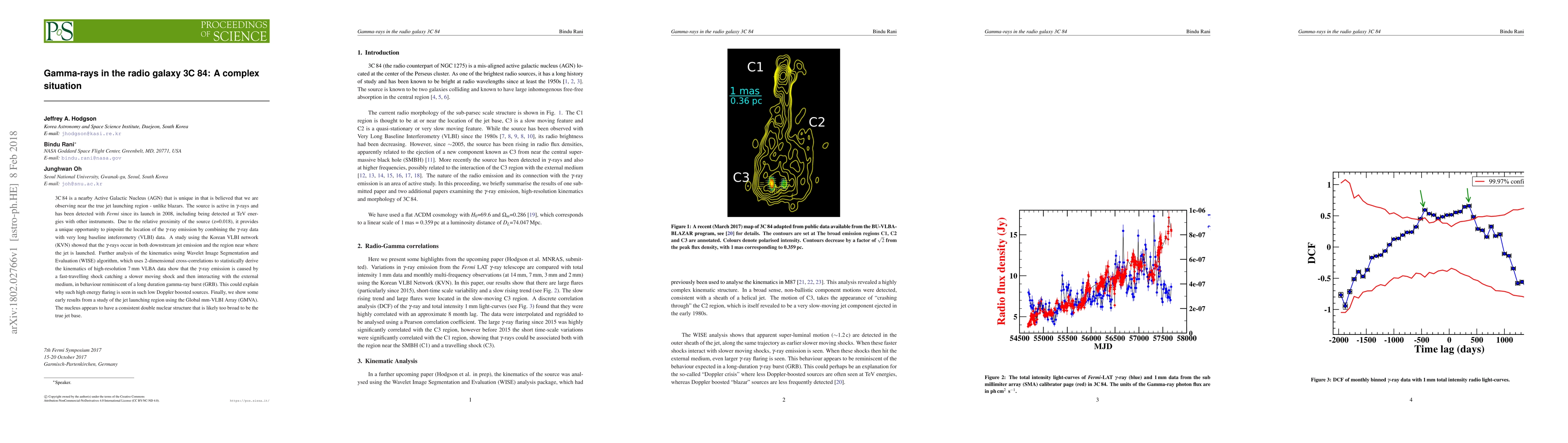 3C 84 is a nearby Active Galactic Nucleus (AGN) that is unique in that is believed that we are observing near the true jet launching region - unlike blazars. The source is active in Gamma rays and has been detected with Fermi since its launch in 2008, including being detected at TeV energies with other instruments. Due to the relative proximity of the source (z=0.018), it provides a unique opportunity to pinpoint the location of the $\gamma$-ray emission by combining the Gamma ray data with very long baseline inteferometry (VLBI) data. A study using the Korean VLBI network (KVN) showed that the Gamma rays occur in both downstream jet emission and the region near where the jet is launched. Further analysis of the kinematics using Wavelet Image Segmentation and Evaluation (WISE) algorithm, which uses 2-dimensional cross-correlations to statistically derive the kinematics of high-resolution 7 mm VLBA data show that the Gamma ray emission is caused by a fast-travelling shock catching a slower moving shock and then interacting with the external medium, in behaviour reminiscent of a long duration gamma-ray burst (GRB). This could explain why such high energy flaring is seen in such low Doppler boosted sources. Finally, we show some early results from a study of the jet launching region using the Global mm-VLBI Array (GMVA). The nucleus appears to have a consistent double nuclear structure that is likely too broad to be the true jet base.