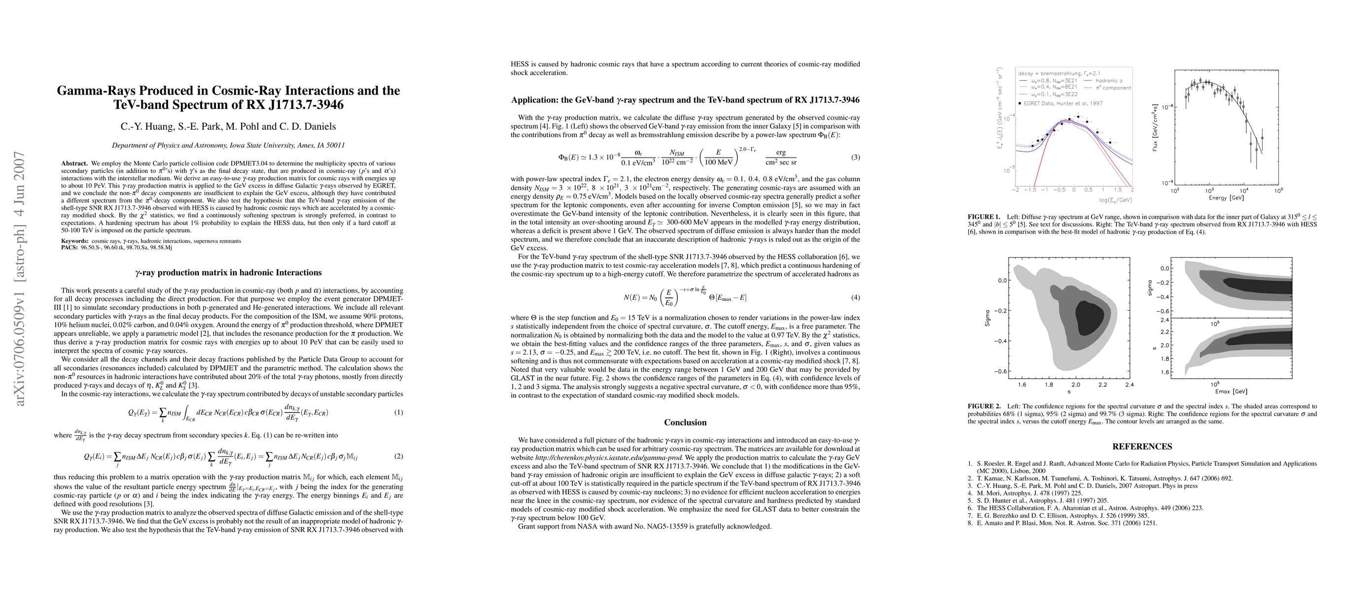 We employ the Monte Carlo particle collision code DPMJET3.04 to determine the multiplicity spectra of various secondary particles (in addition to $\pi^0$'s) with $\gamma$'s as the final decay state, that are produced in cosmic-ray ($p$'s and $\alpha$'s) interactions with the interstellar medium. We derive an easy-to-use $\gamma$-ray production matrix for cosmic rays with energies up to about 10 PeV. This $\gamma$-ray production matrix is applied to the GeV excess in diffuse Galactic $\gamma$-rays observed by EGRET, and we conclude the non-$\pi^0$ decay components are insufficient to explain the GeV excess, although they have contributed a different spectrum from the $\pi^0$-decay component. We also test the hypothesis that the TeV-band $\gamma$-ray emission of the shell-type SNR RX J1713.7-3946 observed with HESS is caused by hadronic cosmic rays which are accelerated by a cosmic-ray modified shock. By the $\chi^2$ statistics, we find a continuously softening spectrum is strongly preferred, in contrast to expectations. A hardening spectrum has about 1% probability to explain the HESS data, but then only if a hard cutoff at 50-100 TeV is imposed on the particle spectrum.