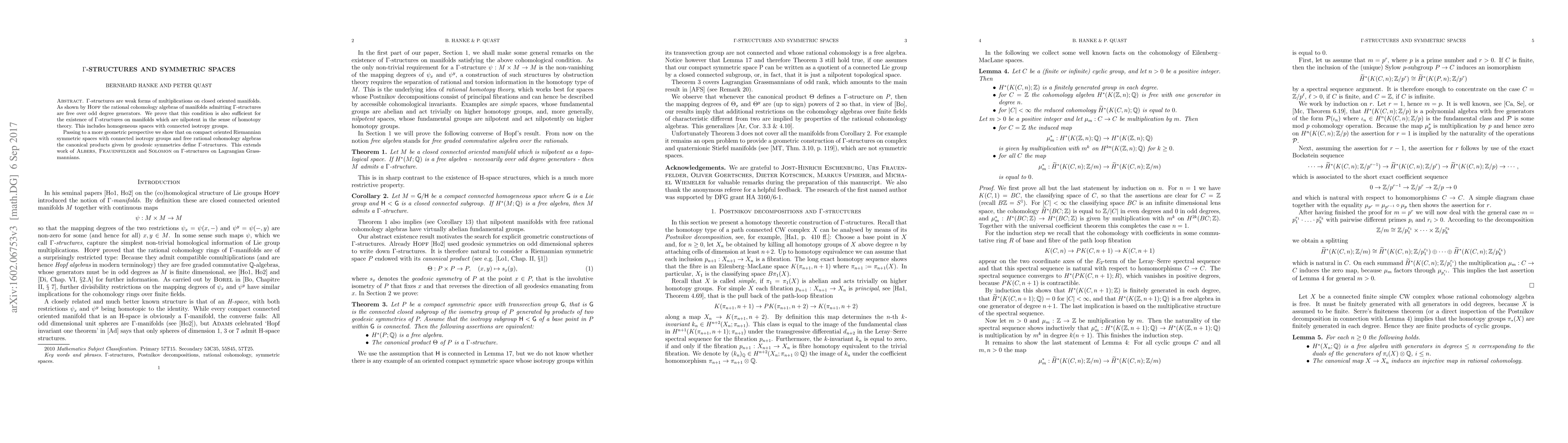 $\Gamma$-structures are weak forms of multiplications on closed oriented manifolds. As shown by Hopf the rational cohomology algebras of manifolds admitting $\Gamma$-structures are free over odd degree generators. We prove that this condition is also sufficient for the existence of $\Gamma$-structures on manifolds which are nilpotent in the sense of homotopy theory. This includes homogeneous spaces with connected isotropy groups. Passing to a more geometric perspective we show that on compact oriented Riemannian symmetric spaces with connected isotropy groups and free rational cohomology algebras the canonical products given by geodesic symmetries define $\Gamma$-structures. This extends work of Albers, Frauenfelder and Solomon on $\Gamma$-structures on Lagrangian Grassmannians.