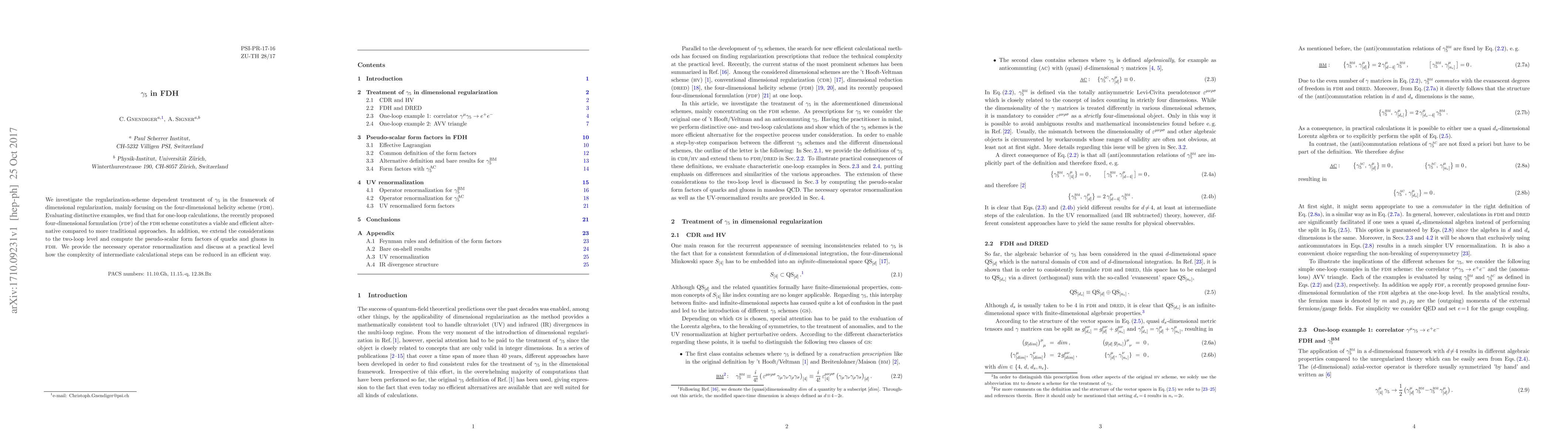 We investigate the regularization-scheme dependent treatment of $\gamma_{5}$ in the framework of dimensional regularization, mainly focusing on the four-dimensional helicity scheme (FDH). Evaluating distinctive examples, we find that for one-loop calculations, the recently proposed four-dimensional formulation (FDF) of the FDH scheme constitutes a viable and efficient alternative compared to more traditional approaches. In addition, we extend the considerations to the two-loop level and compute the pseudo-scalar form factors of quarks and gluons in FDH. We provide the necessary operator renormalization and discuss at a practical level how the complexity of intermediate calculational steps can be reduced in an efficient way.