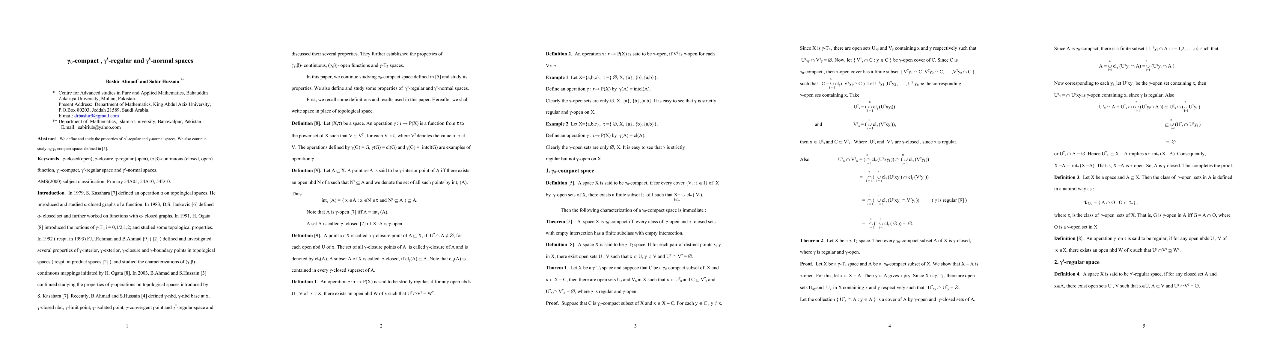 Summary: This paper introduces $\gamma^{*}$-regular and $\gamma$-normal spaces, exploring their properties, and extends the study of $\gamma_{o}$-compact spaces from a previous work. The focus is on the topological characteristics of these newly defined space types.