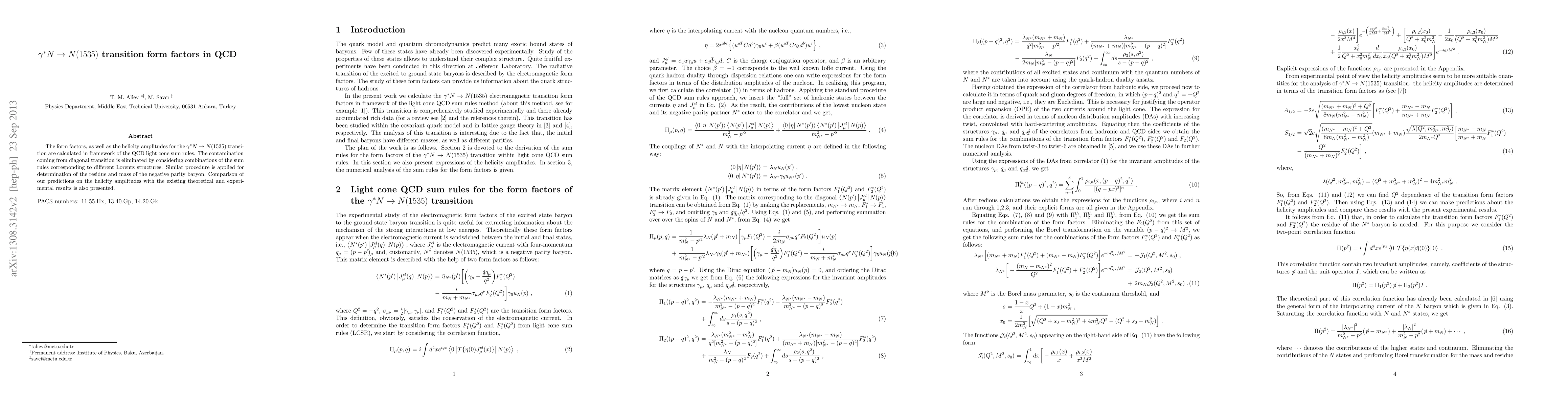 The form factors, as well as the helicity amplitudes for the $\gamma^\ast N \to N(1535)$ transition are calculated in framework of the QCD light cone sum rules. The contamination coming from diagonal transition is eliminated by considering combinations of the sum rules corresponding to different Lorentz structures. Similar procedure is applied for determination of the residue and mass of the negative parity baryon. Comparison of our predictions on the helicity amplitudes with the existing theoretical and experimental results is also presented.