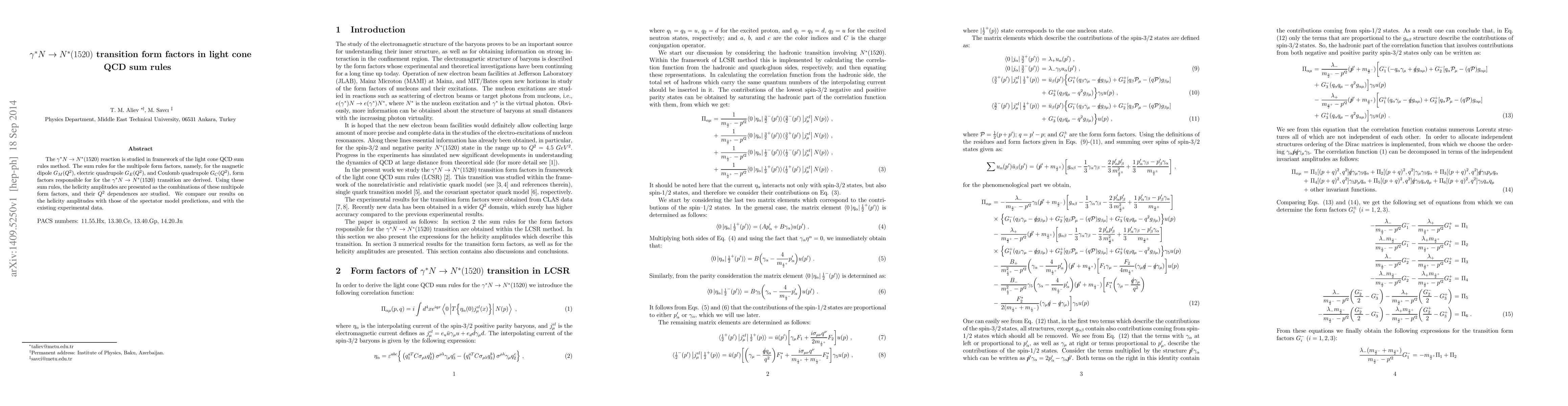 This paper investigates the $\gamma^\ast N \to N^\ast (1520)$ transition within light cone QCD sum rules, deriving sum rules for magnetic dipole, electric quadrupole, and Coulomb quadrupole form factors. The study compares theoretical helicity amplitudes with spectator model predictions and experimental data.